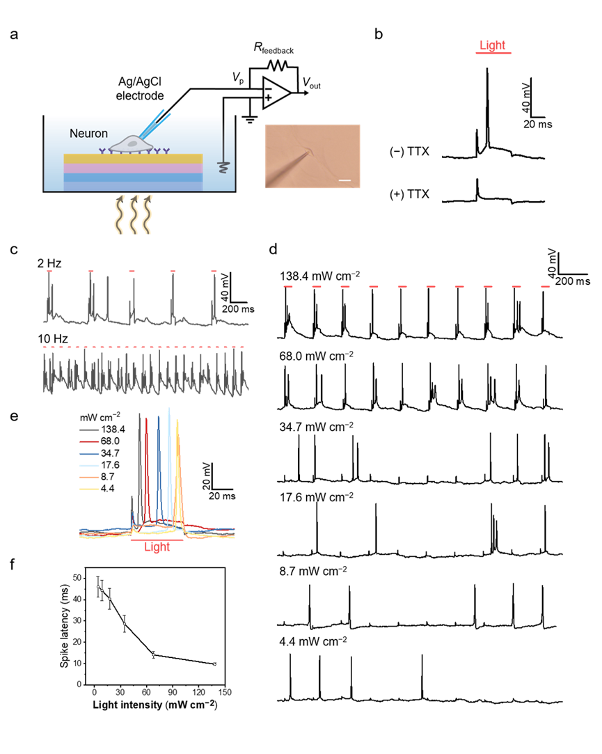 图3. 抗体修饰的生物界面对原代海马神经元的光刺激调控。(a)膜片钳电生理测试示意图。 (b) TTX (1 μM) 添加前后,抗体修饰界面上神经元在光刺激下的膜电位轨迹。(c) 138.4 mW cm−2光强,不同频率光刺激下的神经活动。(d) 不同光强下的神经激活。(e) 不同光强下,光激活神经元产生的典型动作电位。光脉冲参数:5 Hz,50 ms。(f) 不同光强下神经元的平均放电延迟。