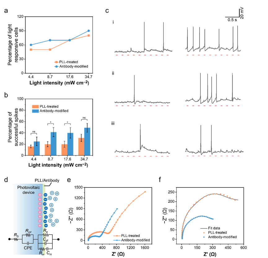 图4. 不同表面修饰生物界面对神经元的光调控性能。(a)不同光强下能够被光激活的神经元占比;(b) 各响应细胞中光激活产生动作电位的成功率; (c) 在 (i) 17.6 mW cm−2、(ii) 8.7 mW cm−2和 (iii) 4.4 mW cm−2光强下,不同表面修饰生物界面上神经元光刺激结果。左列为PLL修饰界面,右列为抗体修饰界面。(d) 简化的等效电路模型。(e) 不同表面修饰生物界面的Nyquist图。(f) 高频区Nyquist图的拟合结果。