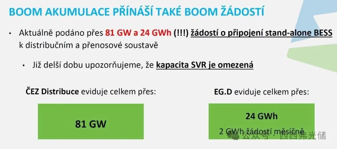 - 截至2025年11月中旬,ČEZ Distribuce 和 EG.D 两大运营商收到的储能并网申请总功率超过 30 GW,总容量超过 105 GWh。