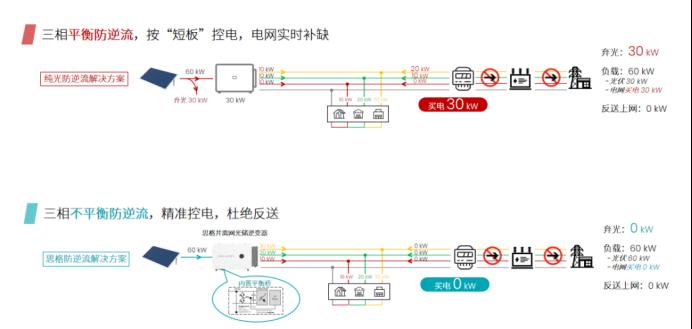 由于工商业负载往往天然“三相不平衡”:用电设备部分使用单相电源,部分使用三相电源,设备开启时间和用电功率存在差异,很难保障三相用电负载相同,可能出现三相分别为 30 kW、20 kW、10 kW 这样的情况。在防逆流场景下,传统逆变器无法按需分配功率,系统只能按照最小相来限制整体输出,剩余用电需要从电网取电。