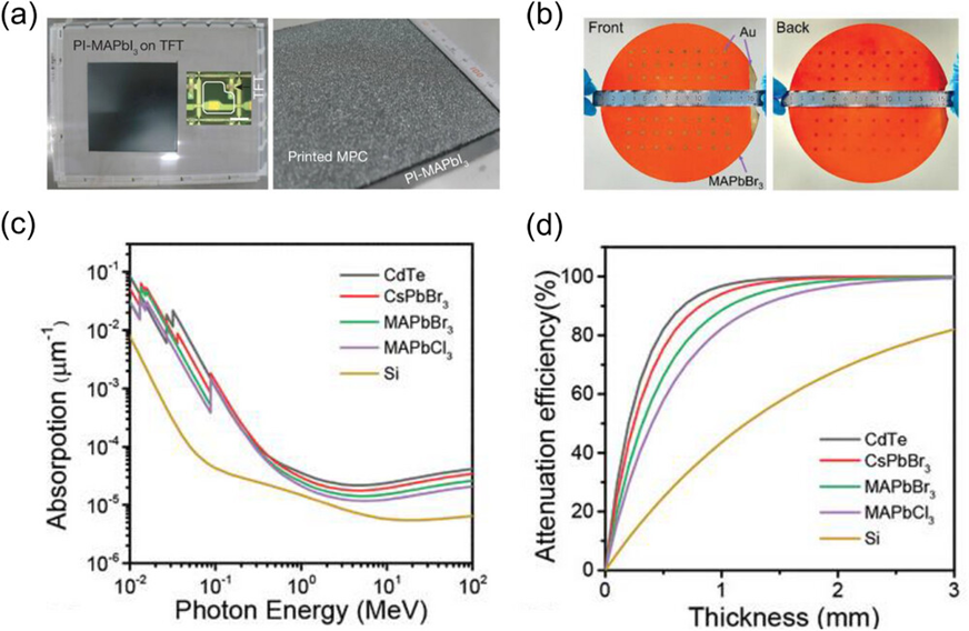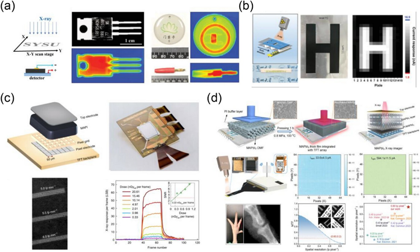 总结了单像素、线阵与平板阵列三类MPMHP成像方案。单像素与线阵适用于安检等扫描类应用,但存在成像速度与分辨率限制。平板阵列是未来重要的探索方向,需要将大面积、低温制备的钙钛矿吸收层与TFT/CMOS背板进行集成。强调了厚膜可直接低温涂覆,而晶圆需以“先制备后贴合”方式集成。多篇研究已实现高分辨率(>3–6 lp/mm)、低剂量成像,成功展示电子元件、生物组织等高质量图像,验证了MPMHP在高性能平板探测器中的潜力。