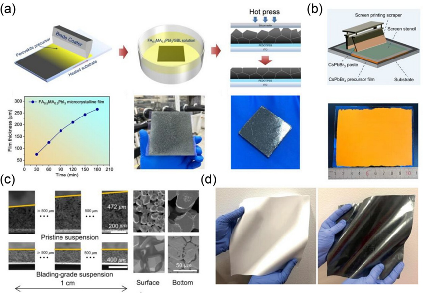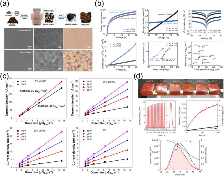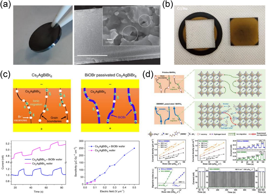 系统回顾了MPMHP厚膜与多晶片的制备技术,包括溶液法、悬浮液涂覆、热压烧结、固相烧结、熔融法等。多晶钙钛矿具有高衰减系数、高μτ值和低成本制备等优势,可实现毫米级厚度以提升X射线吸收效率。强调了其灵活的制备工艺使其具备与单晶相近或更高的探测性能,如高灵敏度(>104–105 µC Gyair-1cm-2)和低检测限(~0.1 nGyair s-1级别),并总结了通过缺陷钝化、成分调控、热压重构及异质结构筑等策略提升材料电学性能和抑制离子迁移的进展。