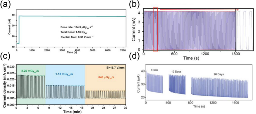 指出MPMHP在湿度、氧气、偏压与辐照下的稳定性仍是产业化瓶颈,测试环境应包括长时间照射、连续开关响应和存储稳定性。部分器件已展示数千秒稳定的开关响应与长时间开启响应,甚至超1年的存储稳定性。
