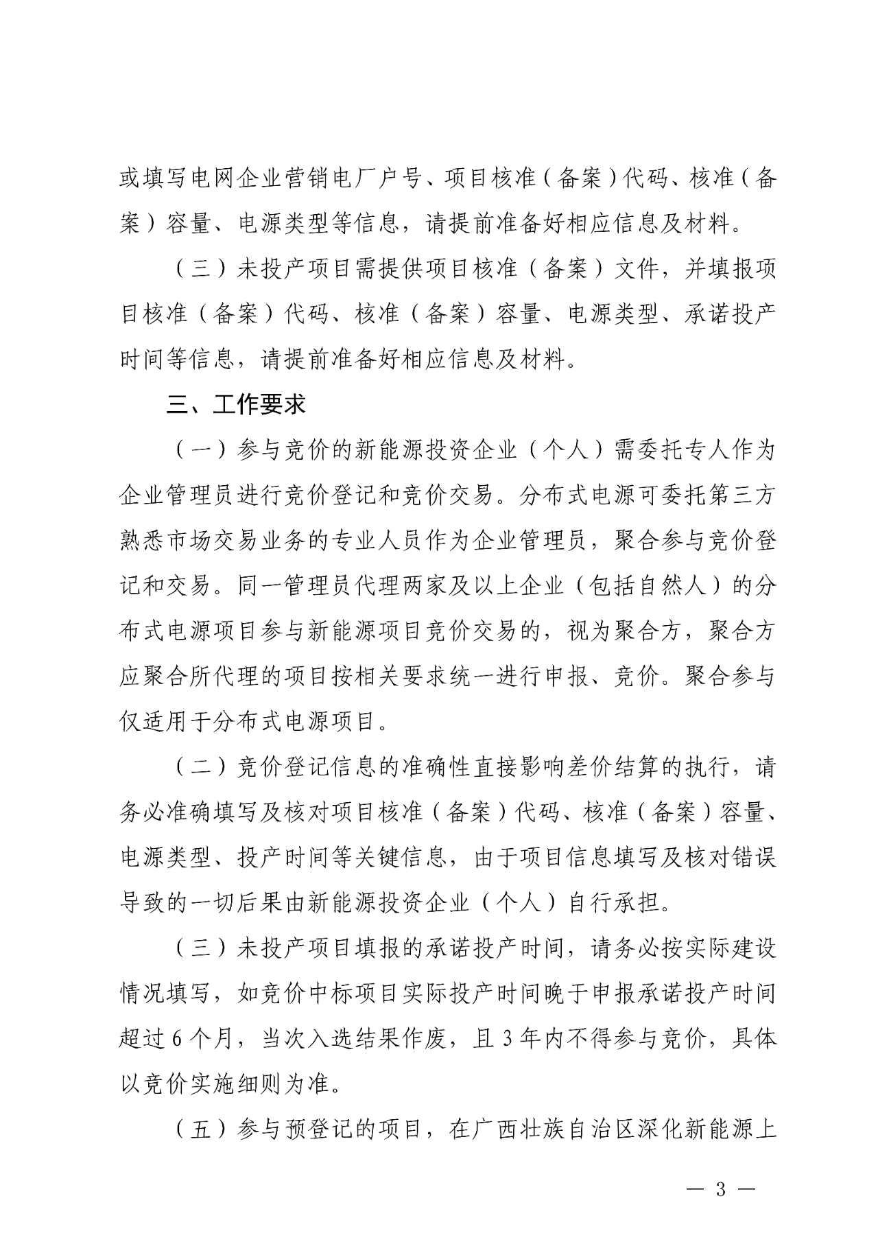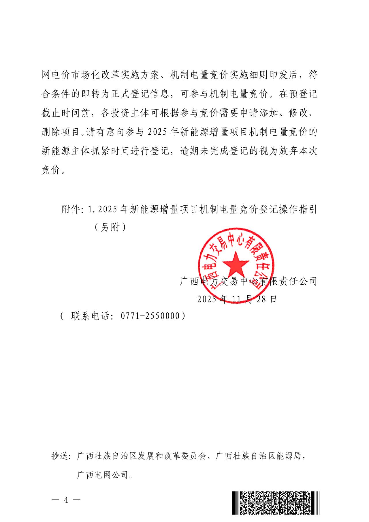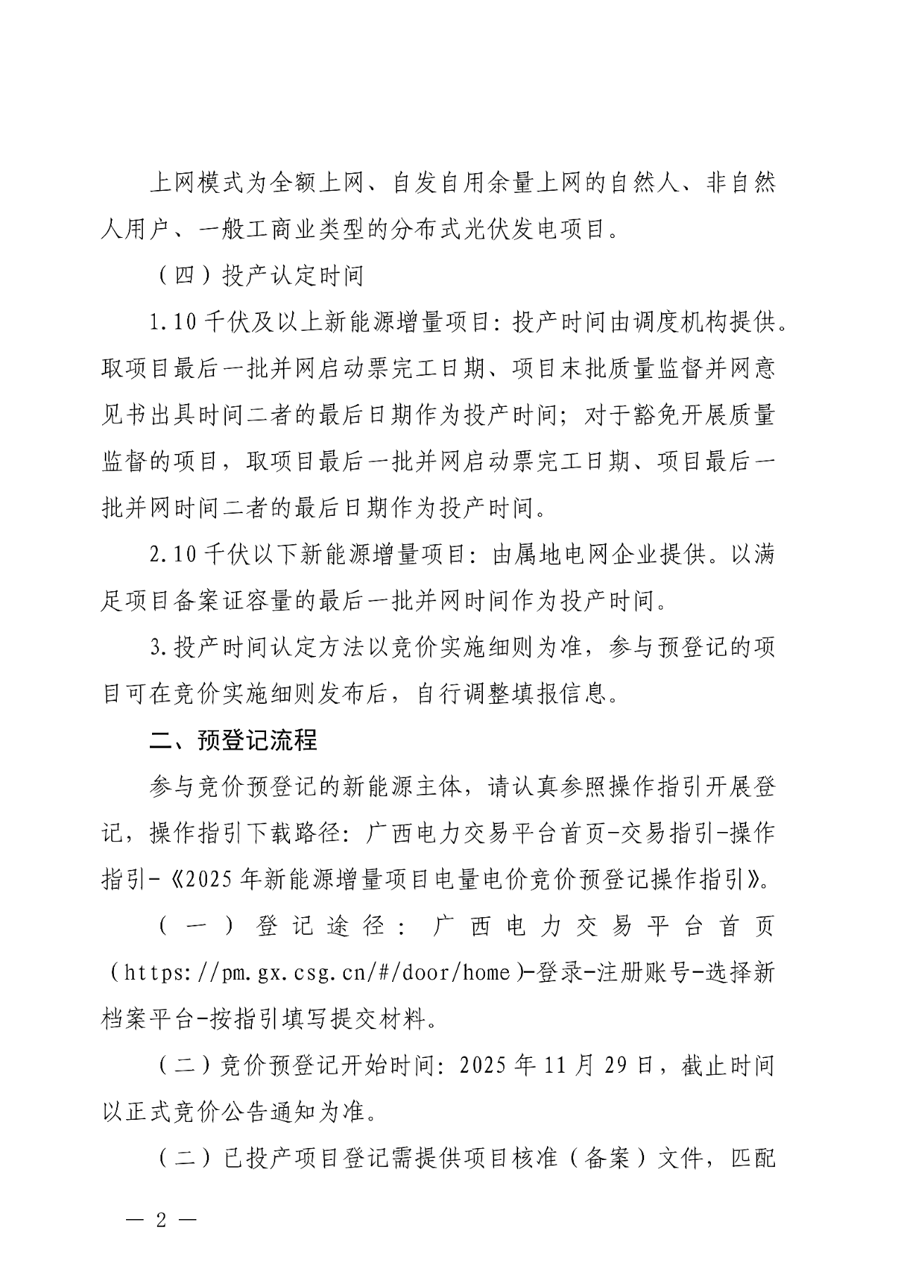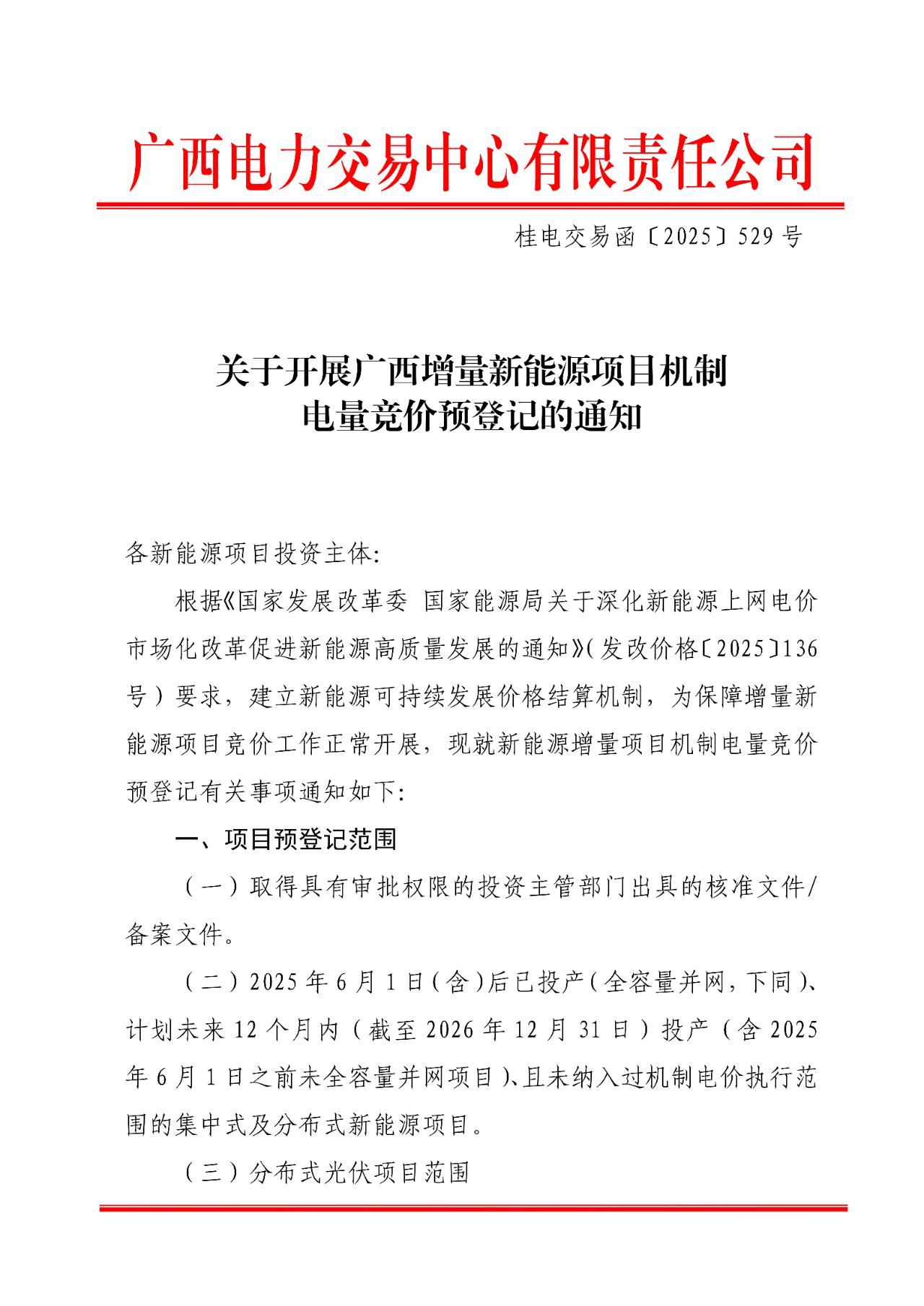 11月28日,广西电力中心发布《关于开展广西增量新能源项目机制电量竞价预登记的通知》,根据通知,对参与新能源增量项目机制电量竞价的项目,开展预登记。项目预登记的条件:2025年6月1日(含后已投产(全容量并网)、计划未来12个月内(截至2026年12月31日)投产含2025年6月1日之前未全容量并网项目)、且未纳入过机制电价执行范围的集中式及分布式新能源项目。要求未投产项目填报的承诺投产时间,请务必按实际建设情况填写,如竞价中标项目实际投产时间晚于申报承诺投产时间超过6个月当次入选结果作废,且3年内不得参与竞价。