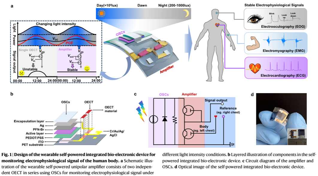 本文展示了一种采用双OECT串联结构、由优化后的OSC供电的低功耗自供电生理传感器,相较于单个OECT生物传感器,其信号输出更稳定、响应更快。我们通过抑制电荷复合并提高柔韧性,构建了高效且更稳定的OSC为放大器供电,从而促进长期、按需使用。该集成器件可贴附于人体皮肤,在宽光照范围(500–50,000 lux)内稳定监测心电、肌电和眼电信号。该设计为无需外部供能/储能的可穿戴低功耗自供电生物传感器提供了简洁架构,凸显了其在实时疾病诊断与预防中的潜力。