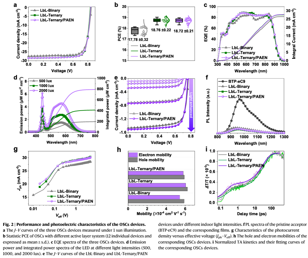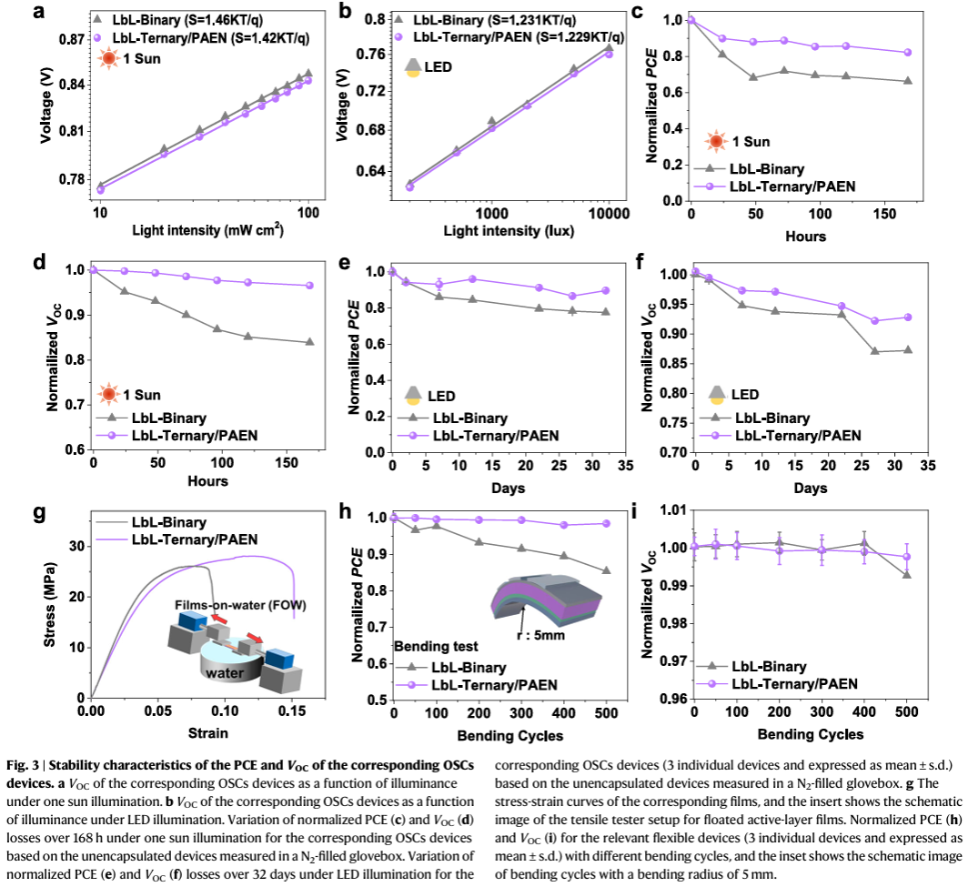 - 高效稳定OSC提升系统性能:通过引入BS3TSe-4F作为客体受体及绝缘聚合物PAEN,构建PM6/PAEN/BTP-eC9:BS3TSe-4F三元体系,OSC效率达19.17%,兼具优异的光稳定性和机械稳定性。