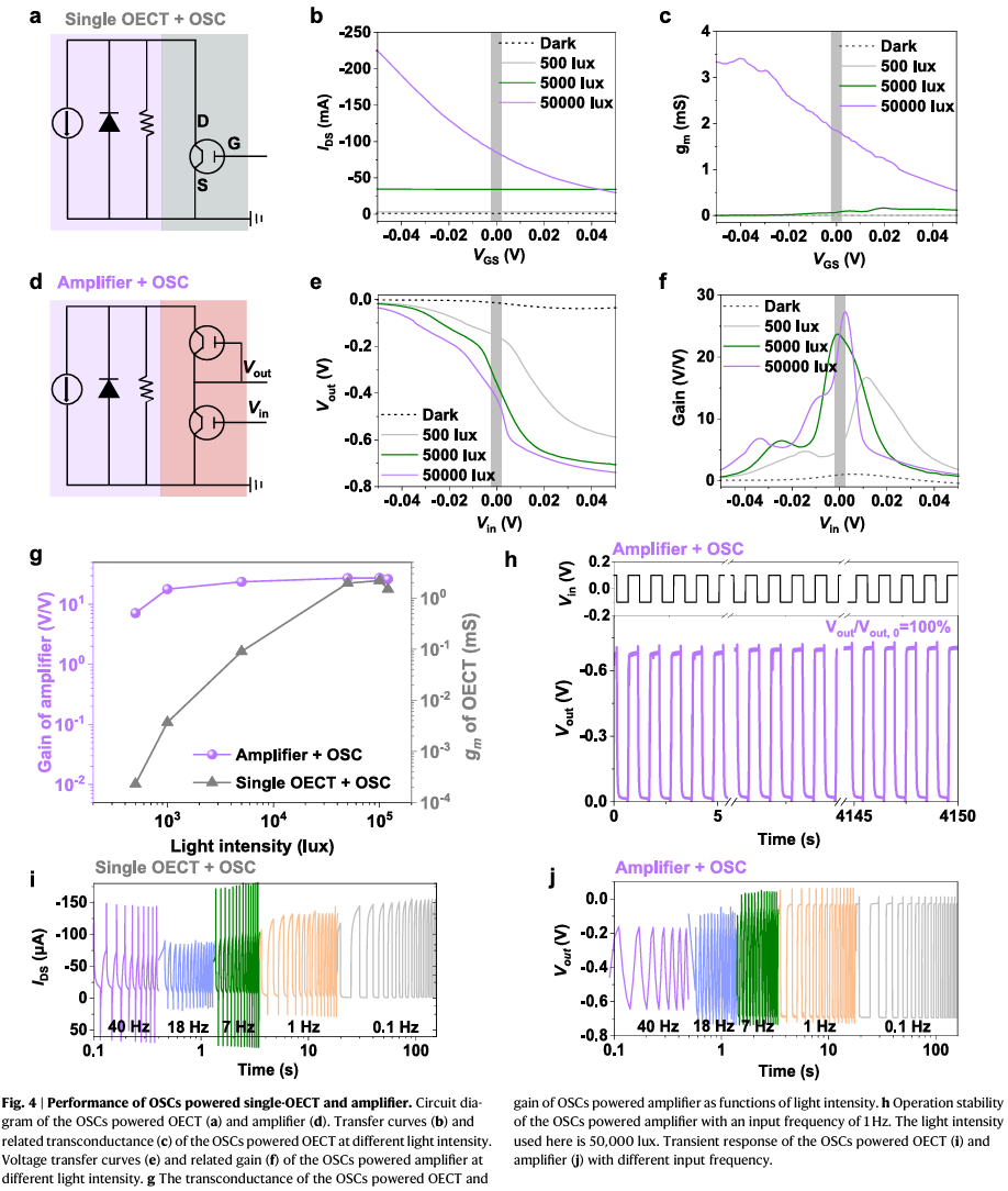 - 双OECT放大器设计实现弱光稳定供电:采用串联双OECT构成低功耗放大器,配合优化后的OSC,在500–50,000 lux宽光照范围内实现稳定信号输出,克服了传统单OECT在弱光下输出波动大的问题。