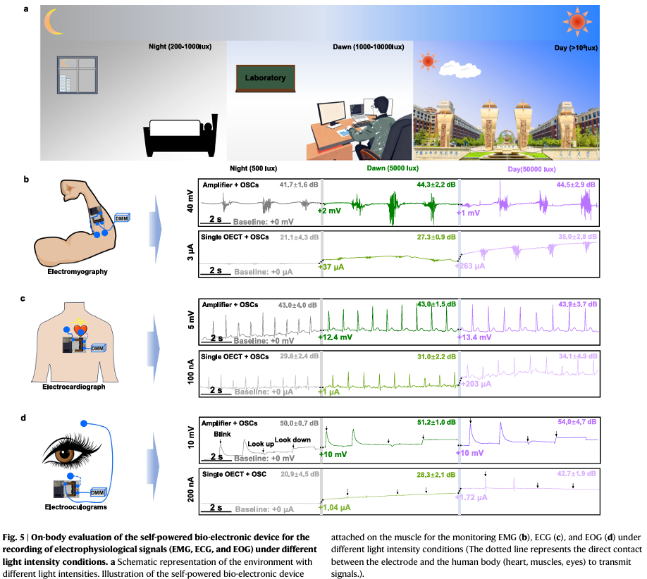 - 集成器件实现全天候生理信号监测:自供电传感系统可贴附皮肤,稳定采集心电、肌电、眼电信号,并在不同光照环境下保持高信噪比,展现出在实时健康监测与人机交互中的广泛应用潜力。