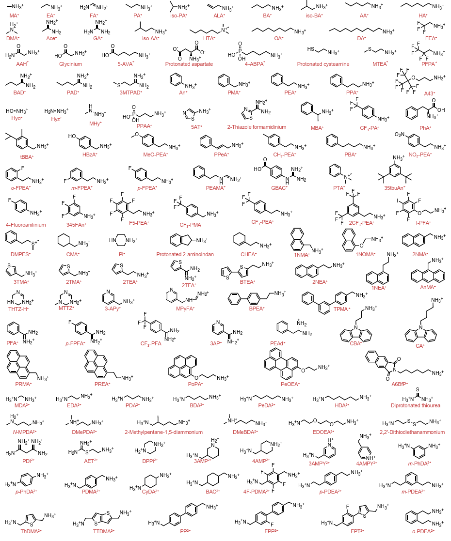 - 结构-性能关联机制:系统阐明了A位阳离子的分子结构如何影响其与钙钛矿骨架的相互作用,并最终决定器件的效率与长期稳定性,为理性分子设计提供了理论基础。