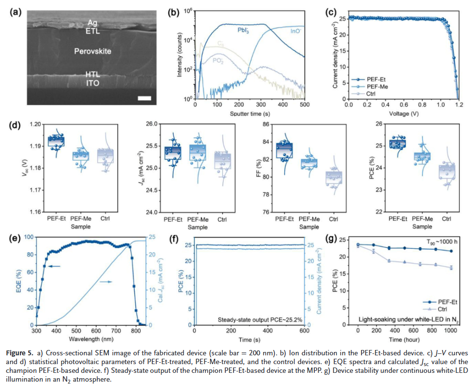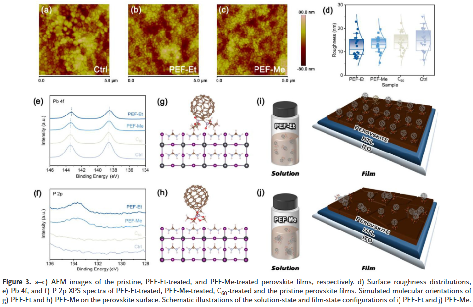 为了解决这些问题,福建师范大学刘然、邢舟和广西师范大学李书辉等人设计并合成了两种新型的磷官能团化富勒烯材料(PEF-Me和PEF-Et),通过简单的反溶剂法加入到电池中。磷官能团的引入,就像给富勒烯装了“抓手”,既提高了它的溶解性,又让它能牢牢地抓住钙钛矿表面。通过调控分子末端的烷基链,成功在钙钛矿表面构建了一层均匀的电子提取层。最终,基于PEF-Et的冠军电池实现了25.62% 的光电转换效率,并且在连续光照1000小时后,仍能保持91.7% 的初始效率,性能卓越。