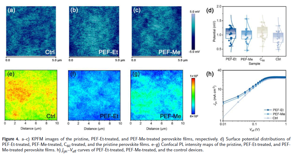 - 均质化层是关键:研究揭示,具有更长乙基链的PEF-Et分子在溶液中分散性更好,能在钙钛矿表面形成更均匀、致密的电子提取层,这是实现高效电子传输和收集的核心。