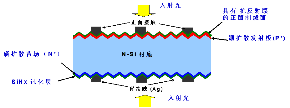 2009 年是我国N型高效电池研发与大规模生产的元年。这一年,英利集团与荷兰能源研究中心合作,启动 N型 PERT 电池研发与规模化产业化项目,不仅拉开了我国N型电池发展的大幕,也填补了我国N型及双面晶硅电池大规模产业化的空白。N 型 PERT(Passivated Emitter,Rear Totally-diffused cell,即发射极钝化全背面扩散结构N型电池)是 TOPCon电池的前身,也是全球光伏产业中第一种实现 GW 级以上规模产业化的N型硅电池技术。其制备过程以 N型硅为衬底,在正面掺杂硼形成发射极,在硅片背面掺杂磷形成背电场;随后在发射极表面生长 SiOx、Al2O3、SiNx等介质薄膜,形成钝化层与抗反射薄膜,最后通过双面印刷银(铝)浆,形成双面电池结构。