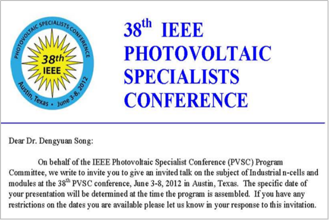 熊猫项目让中国光伏技术成功登上国际技术交流的核心舞台。2012 年 6 月,第 38 届 IEEE 光伏科学家大会在美国奥斯汀召开,我受邀在大会上就 N型熊猫高效电池产业化技术作特邀报告,成为中国光伏产业发展初期,为数不多获国际光伏顶级大会邀请作特邀报告的技术专家。