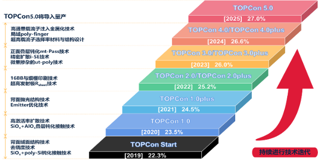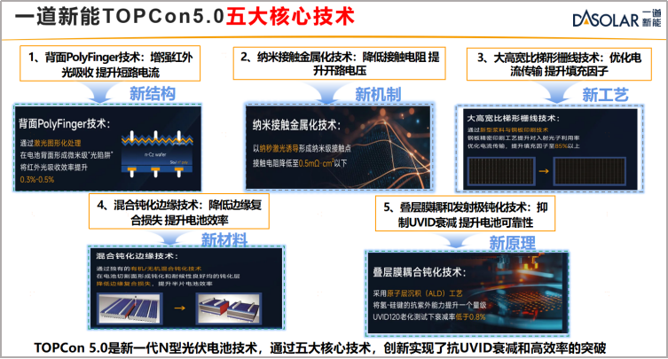 2025年,一道新能量产的TOPCon 5.0技术聚焦于新结构、新机制、新工艺、新材料、新原理五大核心领域的创新,电池量产效率达27%,开路电压达到746mV,具备高效率低成本的产品优势,持续引领着光伏行业技术的进步和发展。