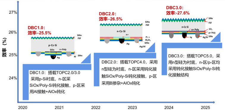 自2020年开始,一道新能创新性地将其先进的SiO₂/Poly-Si钝化接触结构迁移至电池背面,使TOPCon与BC结构结合,由此创立了拥有完全自主知识产权的DBC电池技术。目前,一道新能DBC 电池技术从1.0迭代到3.0 Plus,DBC 3.0Plus技术已使电池平均转化效率超过27.5%,第三方检测效率更是高达27.77%,标志着DBC技术迈入了全新的高效阶段。为光伏产业提供多元化的高效解决方案。