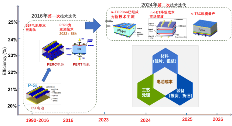 TOPCon 电池的效率为何能快速提升、成本又能迅速下降?核心原因在于其技术路线与上一代 PERT/PERC 技术高度兼容。PERT/PERC 技术已为 TOPCon 铺垫了成熟的设备体系、配套材料体系以及专业人才储备,这使得 TOPCon 在设备投入、供应链端的成本得以降低,人才供给也更为充足,形成了良好的产业生态。正是凭借这一独特优势,TOPCon 不仅成为 N 型光伏技术中产业化速度最快、市场占比最高的路线,更带动了 N 型技术全面开花 —— 从 HJT到xBC,再到钙钛矿与 N 型硅基的叠层技术研发,N 型技术在 TOPCon 的产业化牵引下,形成了主流路线领跑、多元技术互补的发展格局。
