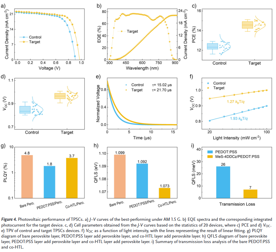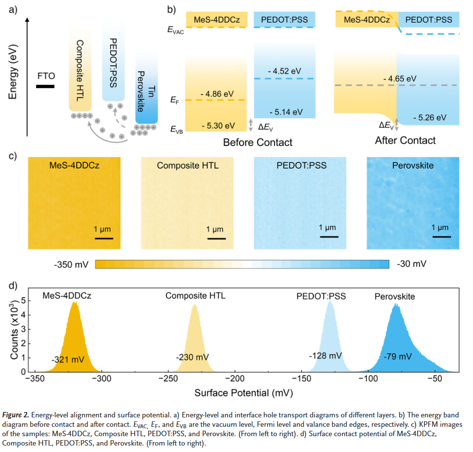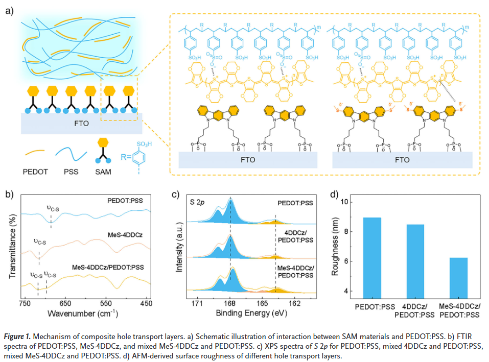 - 创新材料设计: 设计合成带有甲基硫基的咔唑基膦酸自组装单层(MeS-4DDCz),通过其与PEDOT:PSS之间的偶极-偶极相互作用,实现紧密界面接触与能级优化。