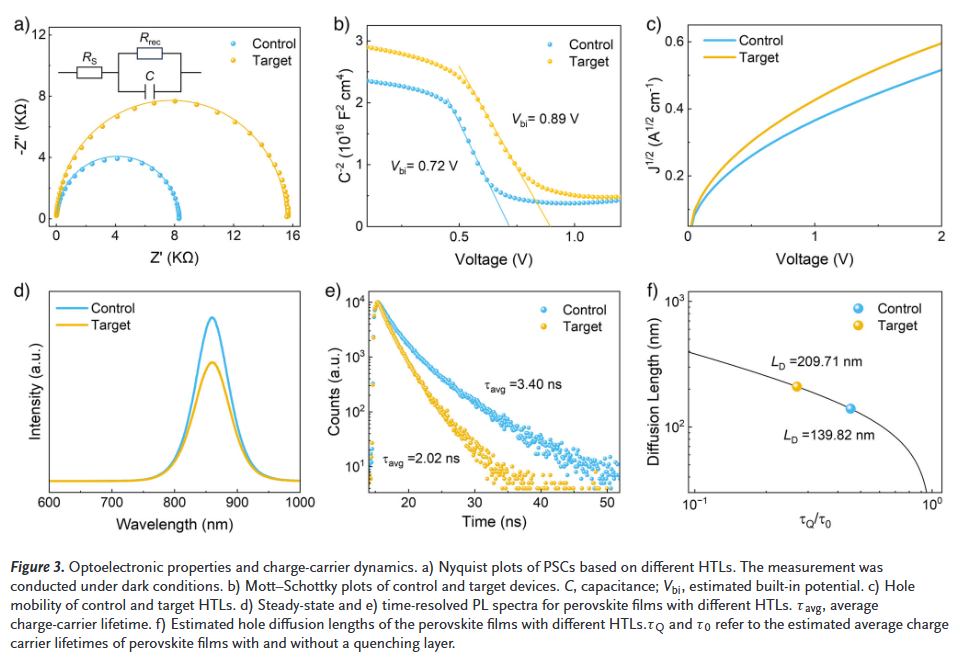 - 复合空穴传输层结构: 构建SAM/PEDOT:PSS复合空穴传输层,显著提升能级对齐、界面兼容性与载流子提取效率。