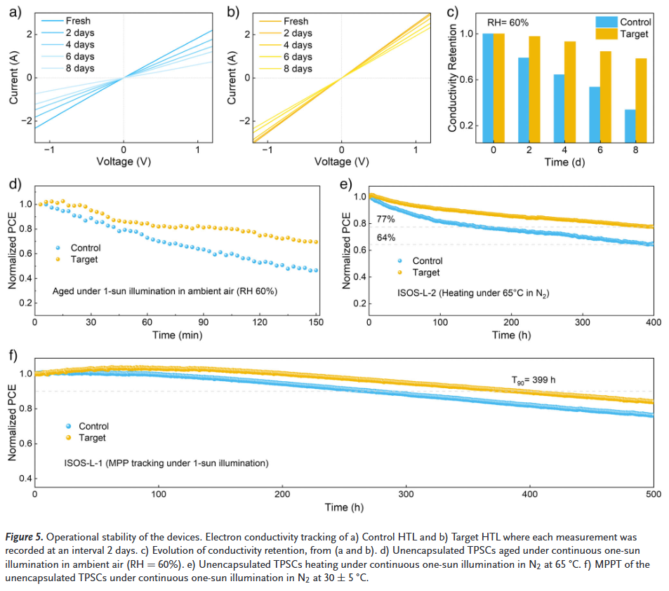 - 高效稳定兼得: 器件在实现15.11%高效率的同时,表现出优异的操作稳定性,未封装器件在持续光照下T90达399小时,湿度与热稳定性也显著提升。