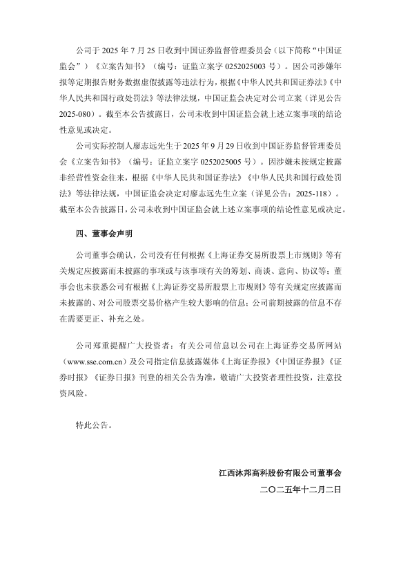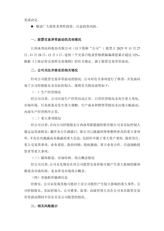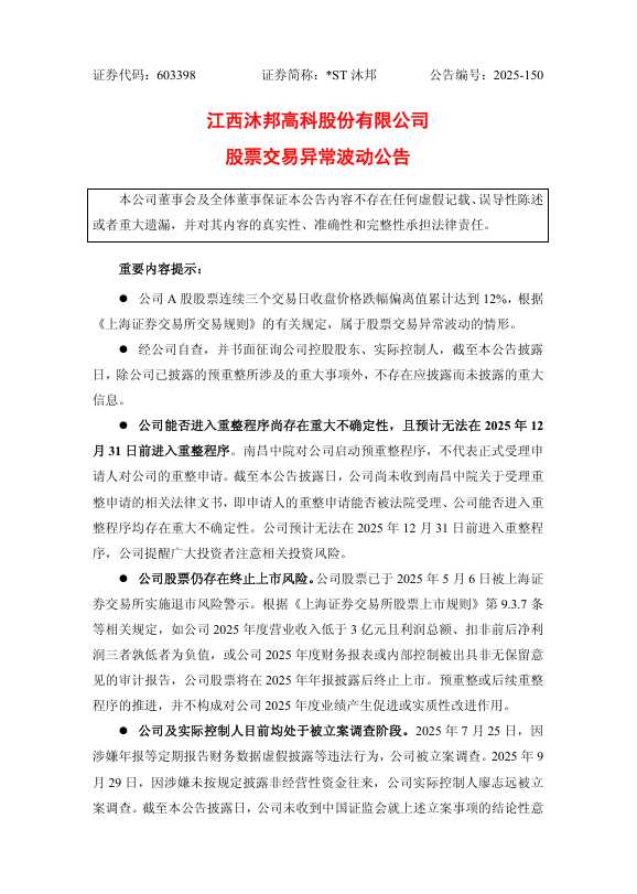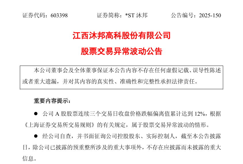 12月2日,江西沐邦高科股份有限公司(*ST沐邦,603398.SH)发布股票交易异常波动公告,公司股票于11月27日至12月1日连续三个交易日收盘价格跌幅偏离值累计超12%,触发异动。公告直指多重风险,提醒投资者谨慎决策。