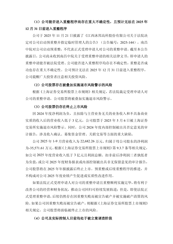 作为已被实施退市风险警示的公司,*ST沐邦的预重整进程未达预期。虽于11月21日获南昌中院启动预重整,但公告明确,这并不等同于法院正式受理重整申请,且预计2025年底前无法进入重整程序。更关键的是,预重整对2025年度业绩无实质性改善作用,无法破解退市危机。