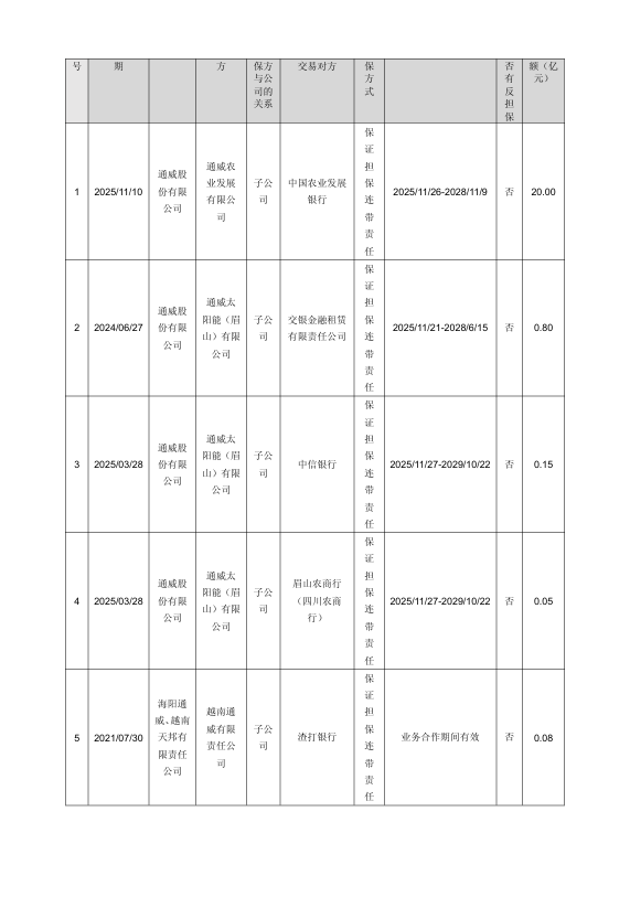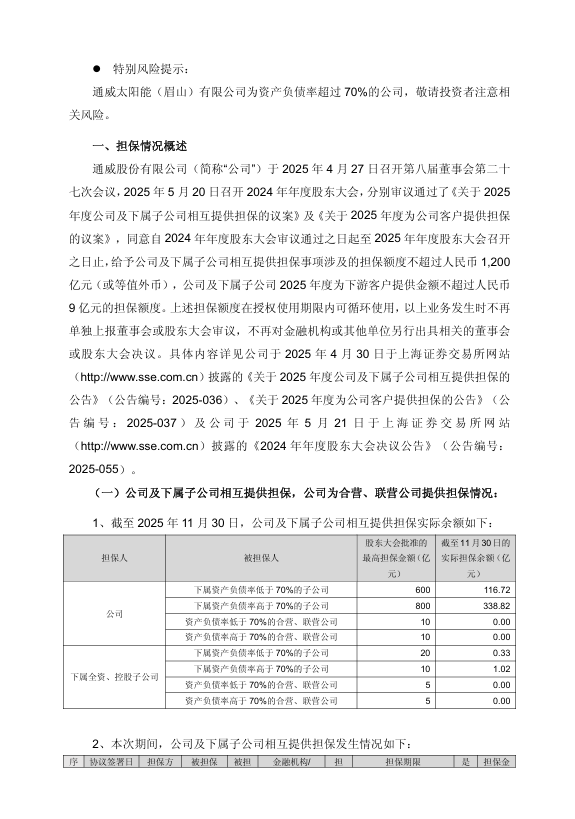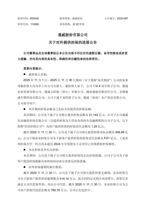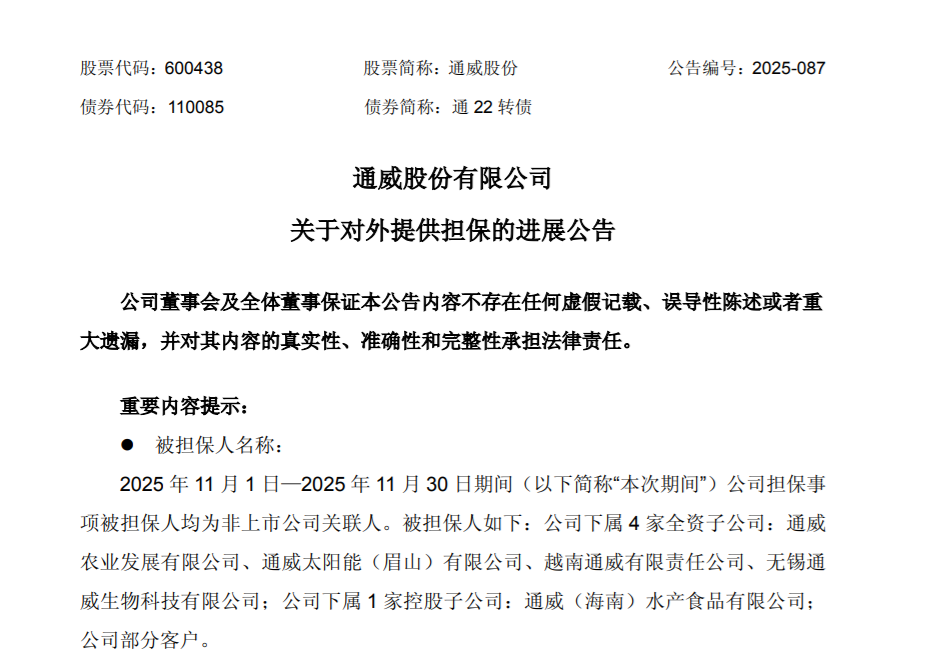 12月3日,通威股份(600438.SH)披露11月对外担保进展公告。数据显示,11月公司及下属子公司相互担保发生额达21.142亿元,子公司为客户提供担保1.29亿元,两项合计超22.43亿元,所有担保均在年度授权额度内。