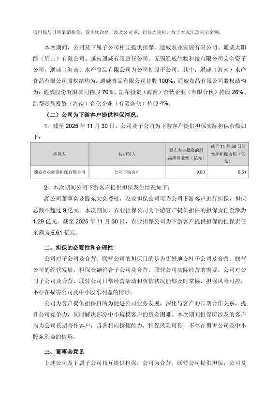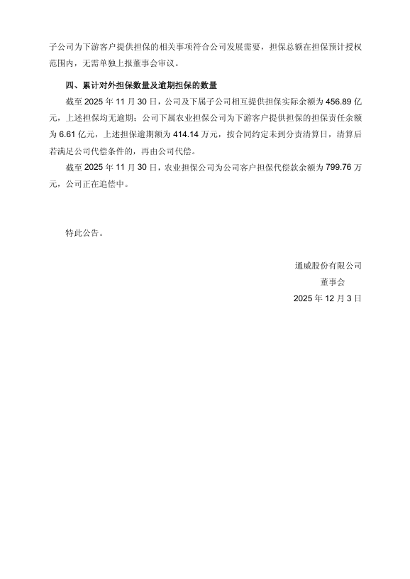 客户担保方面,子公司通威农业融资担保有限公司11月新增担保1.29亿元,截至11月末担保余额6.61亿元,未超9亿元年度额度。虽有部分反担保措施,但存在414.14万元逾期担保,且累计代偿余额799.76万元仍在追偿中。不过对比行业数据,其代偿规模低于农担行业平均水平。