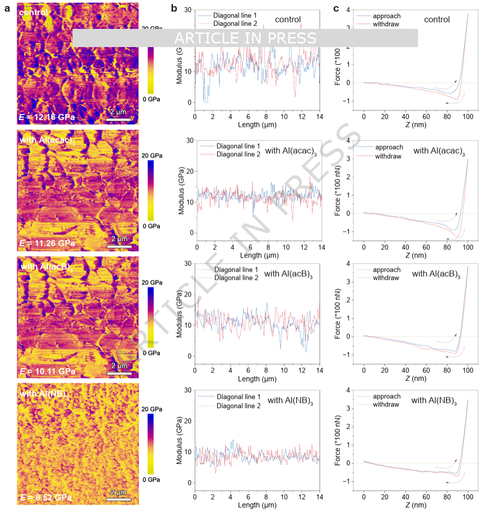 - 纳米力学-光电性能协同调控:系统阐明了金属螯合物通过静电作用与氢键调控薄膜模量与应变,同步提升载流子寿命与器件稳定性,为柔性光电器件设计提供新思路。