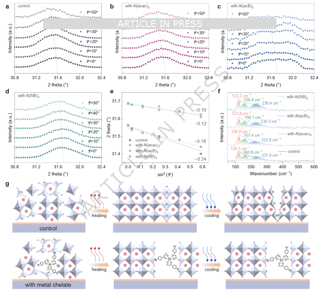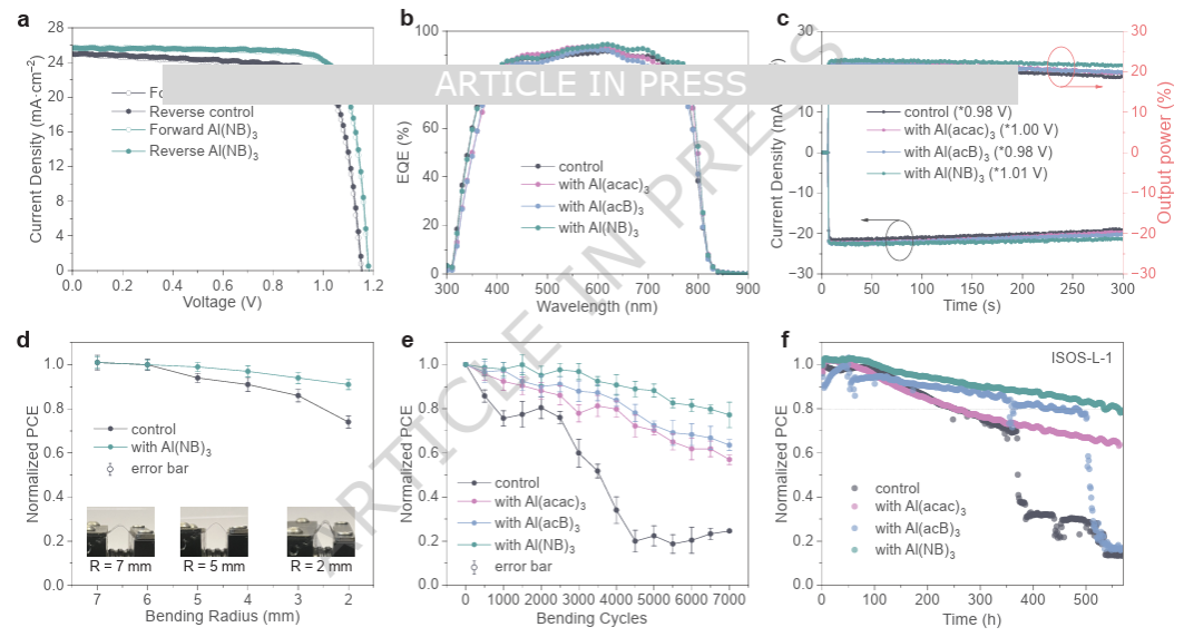 - 首创金属螯合物晶界缓冲策略:通过铝基螯合物在钙钛矿晶界形成动态配位键,有效释放薄膜内部拉伸应变,显著提升机械柔韧性。