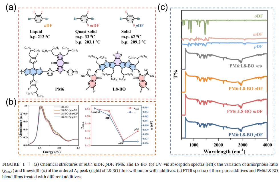 本文德国埃尔朗根-纽伦堡大学Chao Liu、Christoph J. Brabec和华南理工大学陈军武等人揭示了三种原位可移除(ISR)的同分异构体添加剂——oDF(液态)、mDF(准固态)和pDF(固态)的物理状态如何主导二元OSCs的薄膜形成、分子有序化和器件稳定性。其中,准固态mDF作为一种冷升华的瞬态结构剂:它拓宽了早期溶剂移除窗口,同时加速了中间阶段结晶,收紧π-π堆积,增大相干长度,并编程出有利的垂直相分离,这些通过原位紫外-可见吸收、掠入射广角X射线散射和深度分辨光谱得以解析。mDF与L8-BO的相互作用最强,且能完全从薄膜中蒸发,从而最小化非辐射损失并避免残留添加剂对器件稳定性的不利影响。因此,PM6:L8-BO器件实现了19.28%的光电转换效率(PCE),并具备提升的载流子迁移率和受抑制的陷阱辅助复合;将mDF应用于D18:L8-BO体系可获得20.08%的效率。在70°C、1个太阳光照下,mDF将器件运行稳定性提升至T₈₀ = 477小时,显著优于oDF(58小时)、pDF(279小时)以及无添加剂的对照组(103小时)。