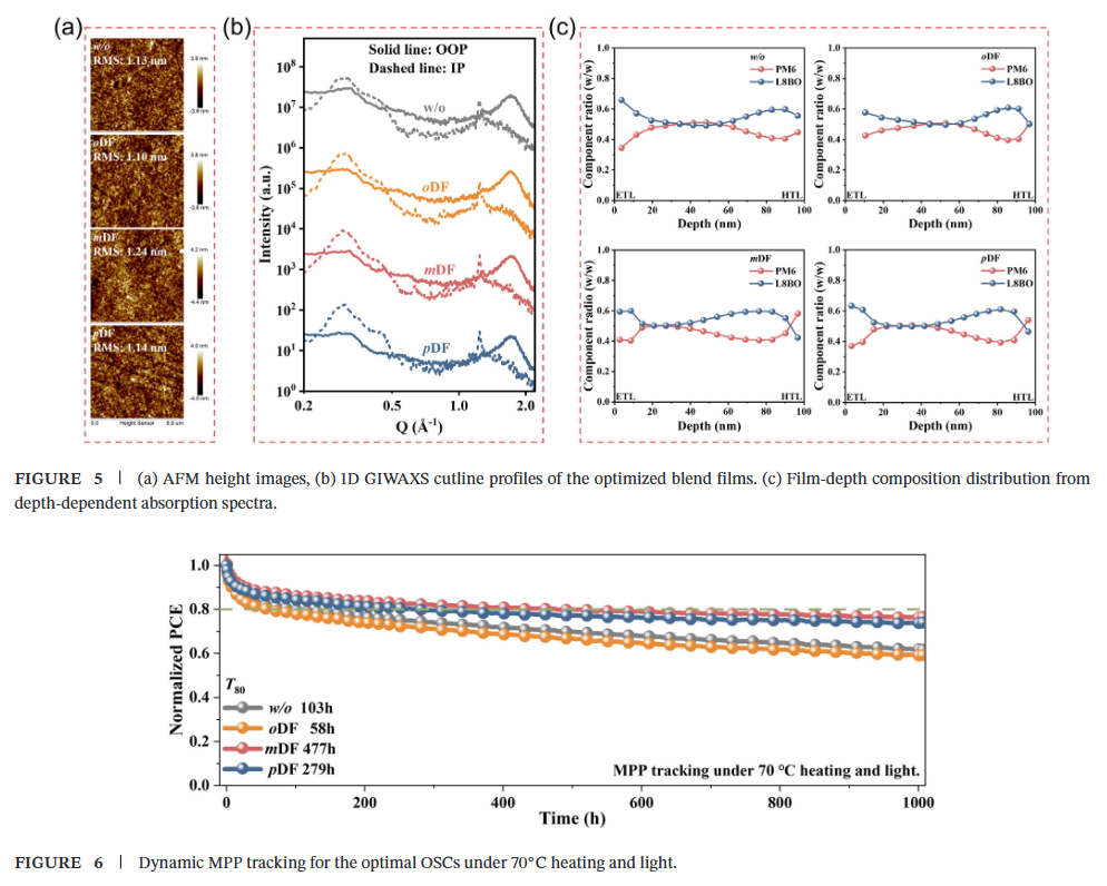 - 同时大幅提升效率与稳定性:mDF通过优化结晶动力学、收紧π-π堆积、增大相干长度并编程有利的垂直相分离,将PM6:L8-BO器件效率提升至19.28%(D18:L8-BO体系超20%),并将高温光照下的运行稳定性(T₈₀)大幅延长至477小时。