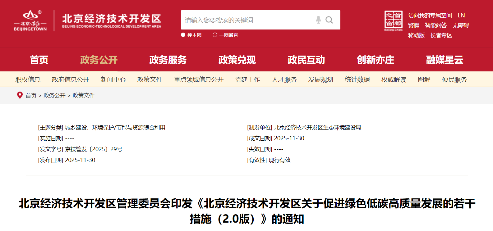 (三)本措施自公布之日起施行,施行期间如遇国家或北京市、经开区相关政策调整的,按照其规定执行。《北京经济技术开发区促进绿色低碳高质量发展若干措施》(京技管发〔2025〕11号)同时废止。