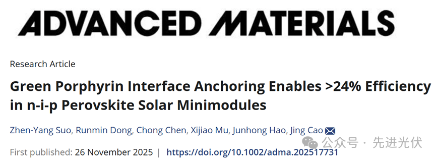 Suo Z Y, Dong R, Chen C, et al. Green Porphyrin Interface Anchoring Enables> 24% Efficiency in n‐i‐p Perovskite Solar Minimodules. Advanced Materials (2025).