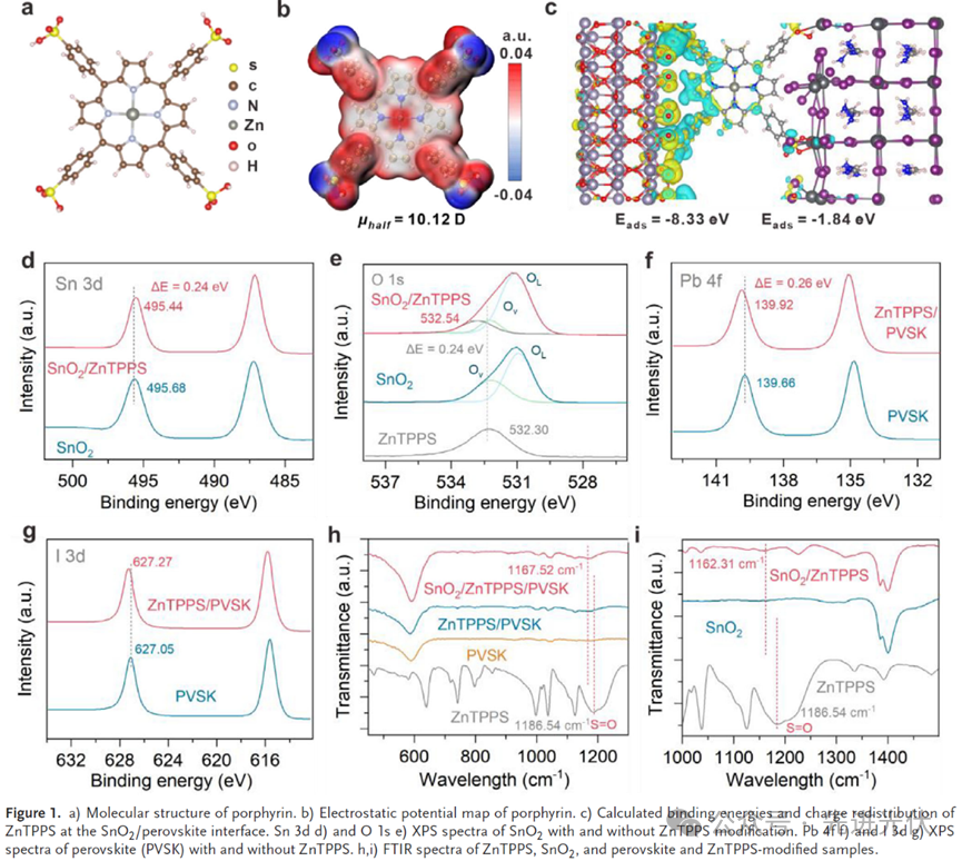 1.本研究采用具有强吸电子磺酸基团的四磺化锌卟啉(ZnTPPS)作为SnO₂与钙钛矿层间的界面修饰剂(图1a)。该分子具有良好的水溶性,便于通过水溶液处理对SnO₂电子传输层进行改性。理论计算表明,磺酸基团赋予ZnTPPS高达10.12 D的强本征偶极矩,源于Zn(II)中心与外围磺酸基团间的显著静电势差异,从而在分子内部建立了强大的定向电场,促进了电荷分离与极化(图1b)。与其他金属卟啉对比,Zn(II)的d¹⁰电子构型更有利于电荷离域与传输。第一性原理计算进一步证实,ZnTPPS在SnO₂和钙钛矿表面均表现出强结合能,表明其以电荷交换为主导的配位作用(图1c)。XPS与FTIR光谱分析为双面配位机制提供了直接证据:Sn 3d、O 1s、Pb 4f等核心能级谱图均发生特征位移,且S=O伸缩振动峰在复合体系中明显红移,共同证实了磺酸基团与Sn⁴⁺和Pb²⁺均形成了稳定的配位键,从而实现了对界面的双重钝化与强化耦合(图1d-i)。