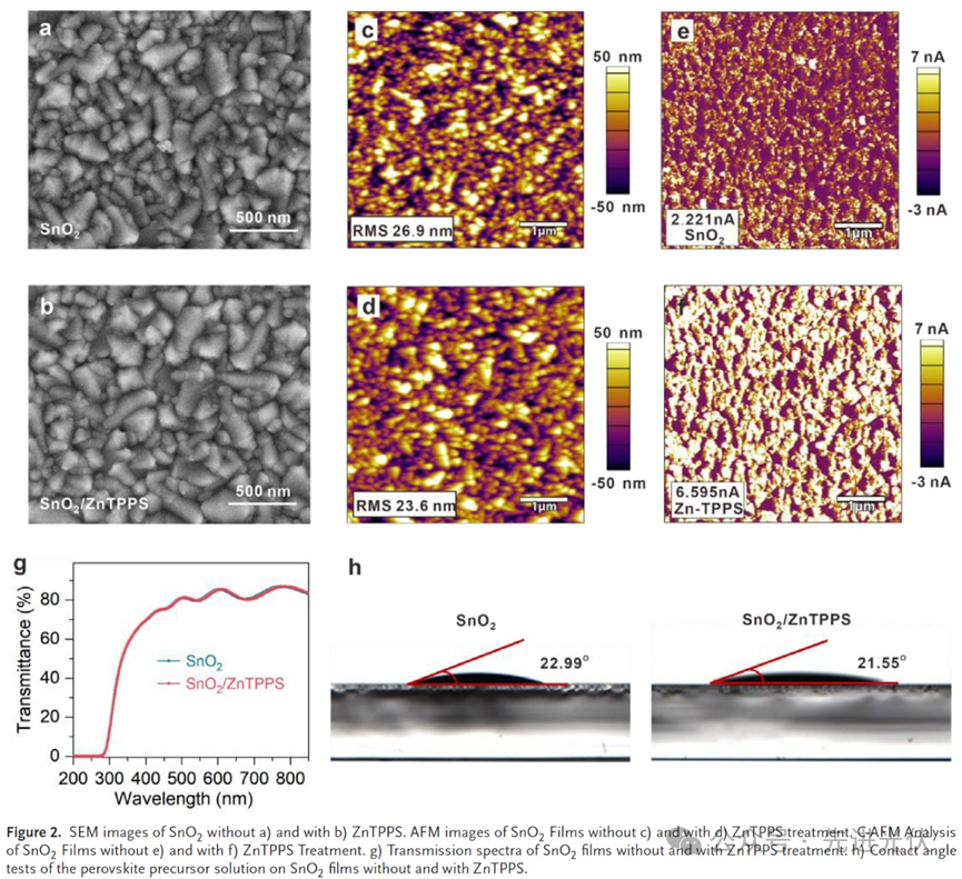 2.图二评估了经ZnTPPS修饰后的SnO₂层的性能变化。通过CBD法制备的原始SnO₂薄膜表面粗糙且缺陷密度较高,而ZnTPPS处理后其表面均匀性得到显著改善。AFM测量显示,平均表面粗糙度从26.9 nm降至23.6 nm,表明薄膜更加平滑。C-AFM分析进一步证实,局部电流响应从2.221 nA大幅提升至6.595 nA,说明电荷提取与传输能力明显增强。光学性能上,UV-vis透射光谱表明ZnTPPS修饰基本保持了SnO₂在200-850 nm范围内的本征透明度,透光率差异仅约1%,对应可忽略的短路电流损失。此外,接触角测试显示,钙钛矿前驱体溶液在修饰后的SnO₂表面的接触角从22.99°减小至21.55°,表明表面润湿性得到改善,这有利于促进后续钙钛矿层的均匀大面积生长与成核控制,从而减少缺陷。这些结果共同表明,ZnTPPS修饰在优化SnO₂形貌、增强电荷传输以及改善界面润湿性方面均发挥了积极作用。