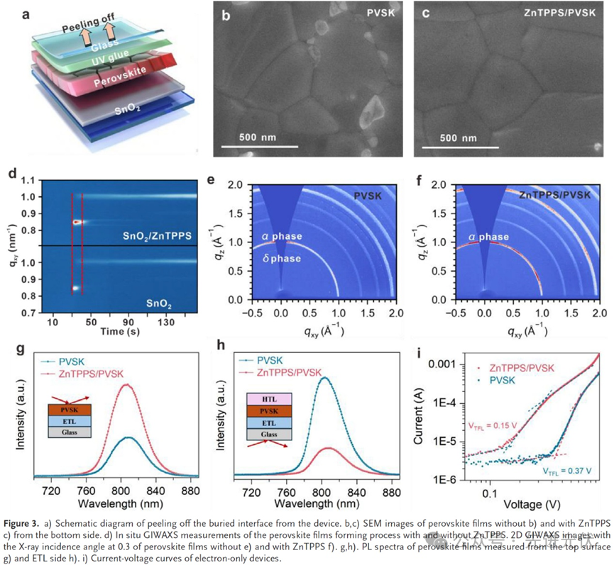 3.图三深入研究了ZnTPPS修饰对钙钛矿结晶动力学与薄膜性能的影响。通过剥离埋底界面观察发现,经ZnTPPS处理的样品显著抑制了界面空洞的形成。SEM和XRD分析表明,修饰后的钙钛矿薄膜晶粒分布更均匀、晶界清晰,且结晶度更高。原位GIWAXS监测显示,修饰后的样品在结晶过程中出现了更持久的中间相,这源于强界面相互作用,使得结晶过程更可控,最终获得更高品质的薄膜。此外,ZnTPPS处理后的薄膜显示出更强的光致发光强度、更长的载流子寿命(534 ns vs. 423 ns)以及更显著的稳态PL猝灭,这共同证明了其界面缺陷减少且电荷提取效率更高。空间电荷限制电流测试进一步定量证实,ZnTPPS修饰将器件的陷阱密度从3.14×10¹⁵ cm⁻³大幅降低至1.27×10¹⁵ cm⁻³,凸显了其优异的界面钝化效果。