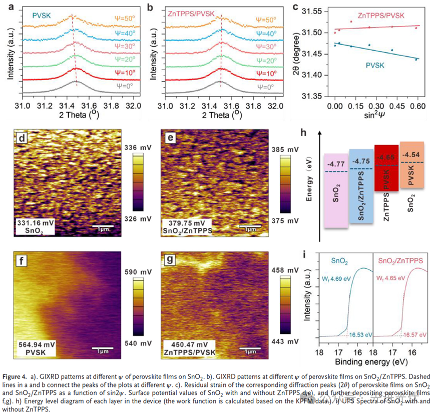 4.图四通过GIXRD、KPFM和UPS等手段,深入分析了ZnTPPS修饰对钙钛矿薄膜残余应力及界面电学性质的影响。GIXRD分析表明,生长在未修饰SnO₂上的钙钛矿薄膜存在明显的本征拉伸应力,而经ZnTPPS修饰后,薄膜应力状态转变为轻微的压缩应力,这显著增强了钙钛矿的结构稳定性。电学表征显示,ZnTPPS的引入提高了SnO₂的表面电势,同时降低了埋底钙钛矿界面的电势。这种调控使SnO₂的功函数降低,而钙钛矿界面处的功函数升高,从而优化了二者之间的能级排列。UPS测试进一步证实,修饰后SnO₂电子传输层的导带与钙钛矿薄膜的导带匹配更为有利。能级排列的改善有效降低了电子注入势垒,促进了电荷的高效分离与传输,并抑制了非辐射复合,为器件性能的提升奠定了关键基础。