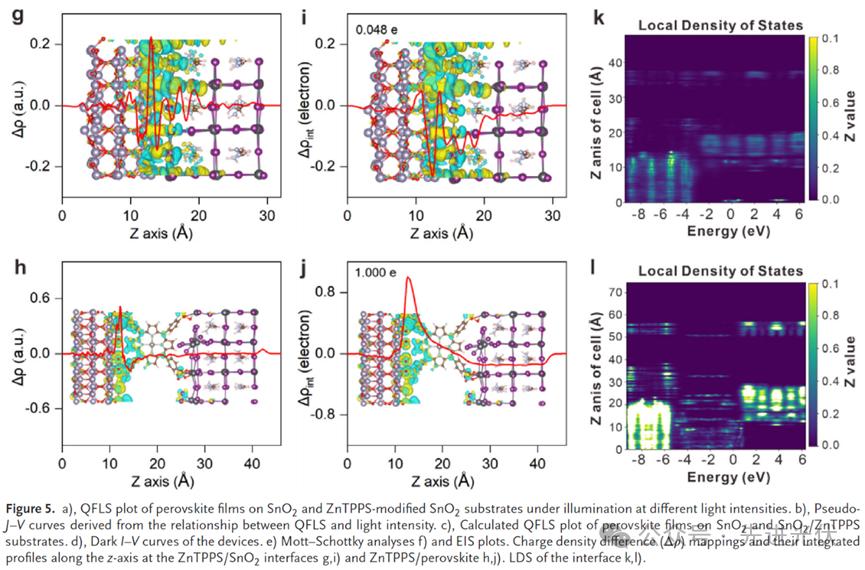5.图五通过多种表征手段深入分析了ZnTPPS修饰对器件物理性能的影响。准费米能级分裂测量表明,修饰后的SnO2/ZnTPPS/钙钛矿体系具有更高的隐含开路电压,这得益于陷阱辅助的非辐射复合被有效抑制。暗电流-电压测试显示,修饰器件在零偏压附近具有更低的暗电流,表明漏电路径减少。通过分析开路电压随光强的变化,得出修饰器件的理想因子仅为1.22,接近理论值1,这是迄今报道的最低值之一,显著证明了肖克利-里德-霍尔复合被大幅抑制。莫特-肖特基电容-电压分析显示,修饰器件具有更高的内置电势,表明电荷分离与收集更高效。电化学阻抗谱则显示出更高的复合电阻,反映了电荷传输增强和复合损失减少。密度泛函理论计算进一步从机理上揭示,ZnTPPS修饰引起了强烈的界面电荷重分布,界面电荷转移量显著增加,并在费米能级附近引入了额外的传输态,形成了高效的电荷传输通道,从而在理论上解释了实验中观察到的载流子分离与传输性能的全面提升。
