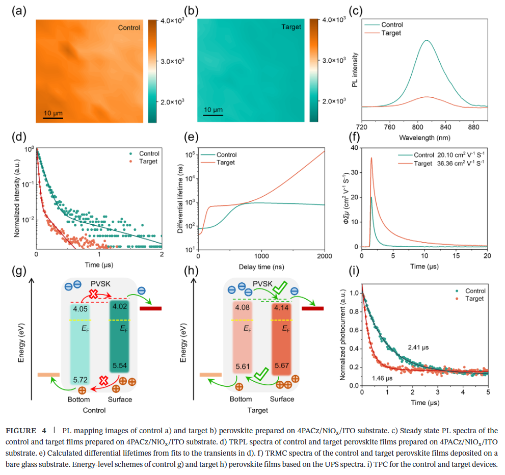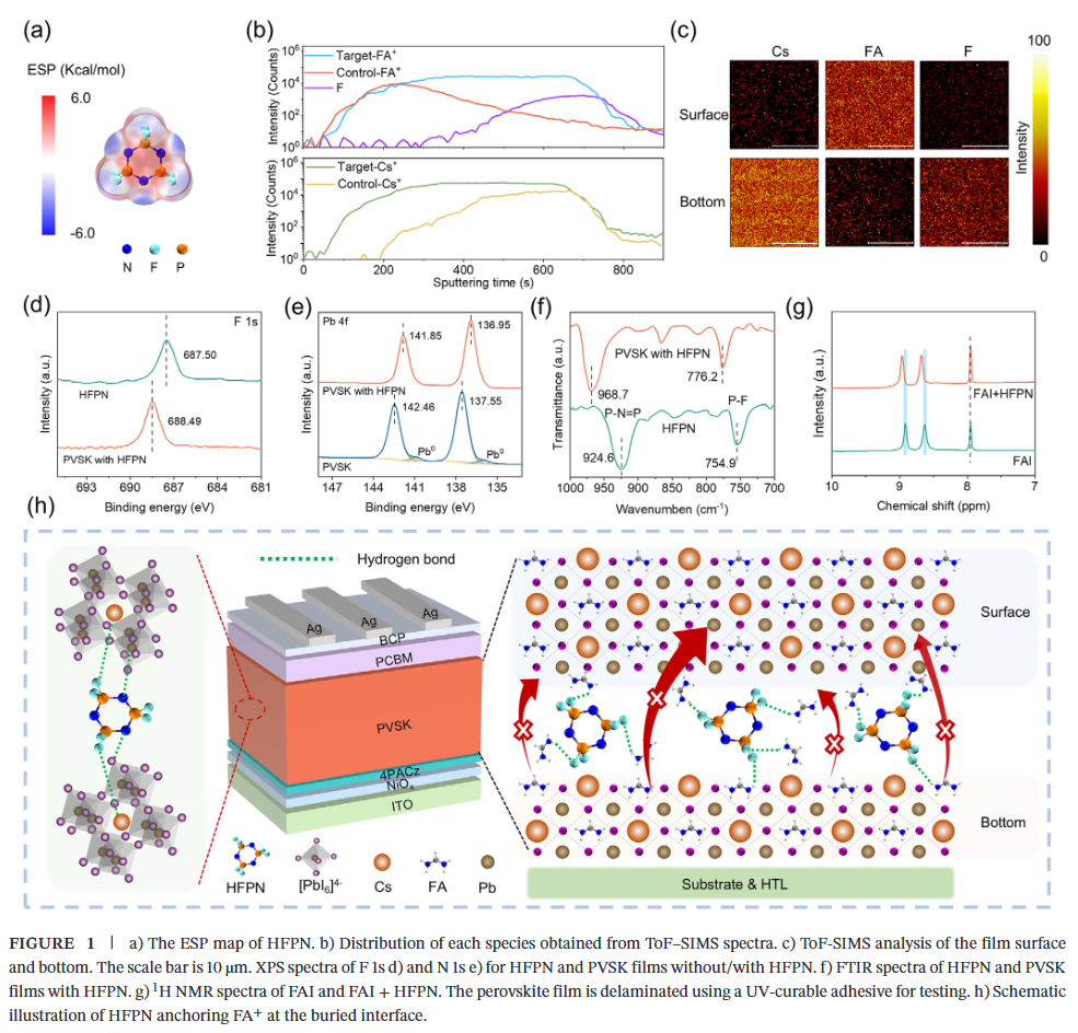 - 阳离子锚定与均匀化:HFPN通过氢键将FA⁺锚定于钙钛矿薄膜底部界面,有效调控Cs⁺与FA⁺的纵向分布,实现全膜层阳离子均匀化,显著降低缺陷密度。