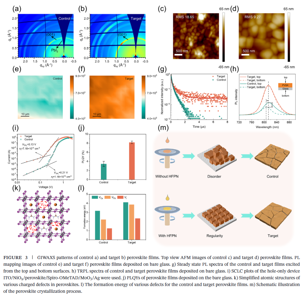 - 应变释放与结晶调控:HFPN增强埋底界面刚性,消除因基底与钙钛矿热膨胀失配引起的残余应力,同时调控成核与生长动力学,获得高结晶度、大晶粒薄膜。