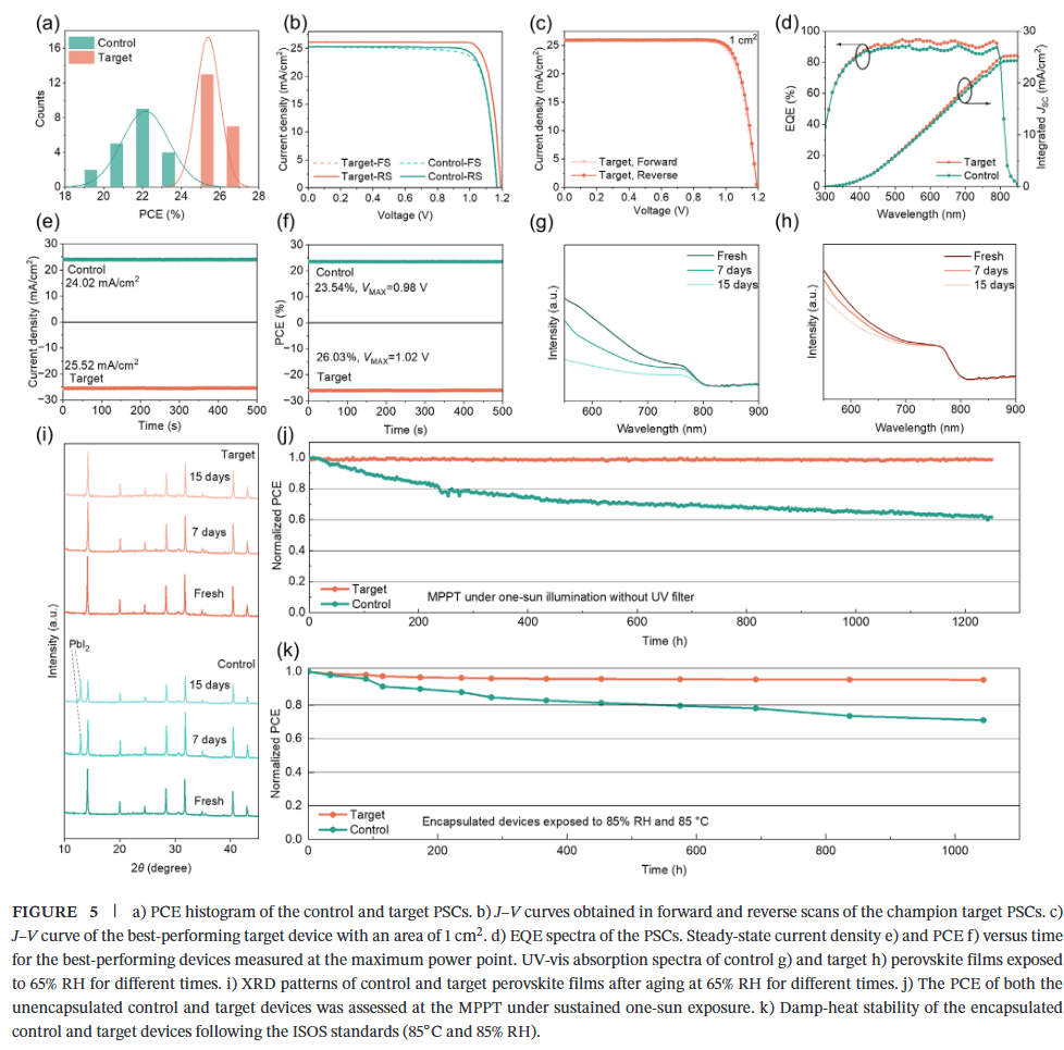 - 高效率与高稳定性兼得:改性器件实现26.55%的高效率(0.09 cm²),并在无封装条件下于MPPT运行1251小时后仍保持95%以上效率,展现出优异的操作稳定性与湿热耐受性。
