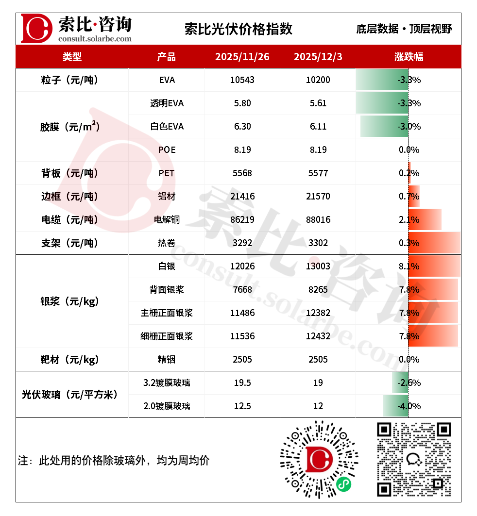 1、数据均为索比咨询整理,价格为均价,有疑问请联系我们,欢迎探讨