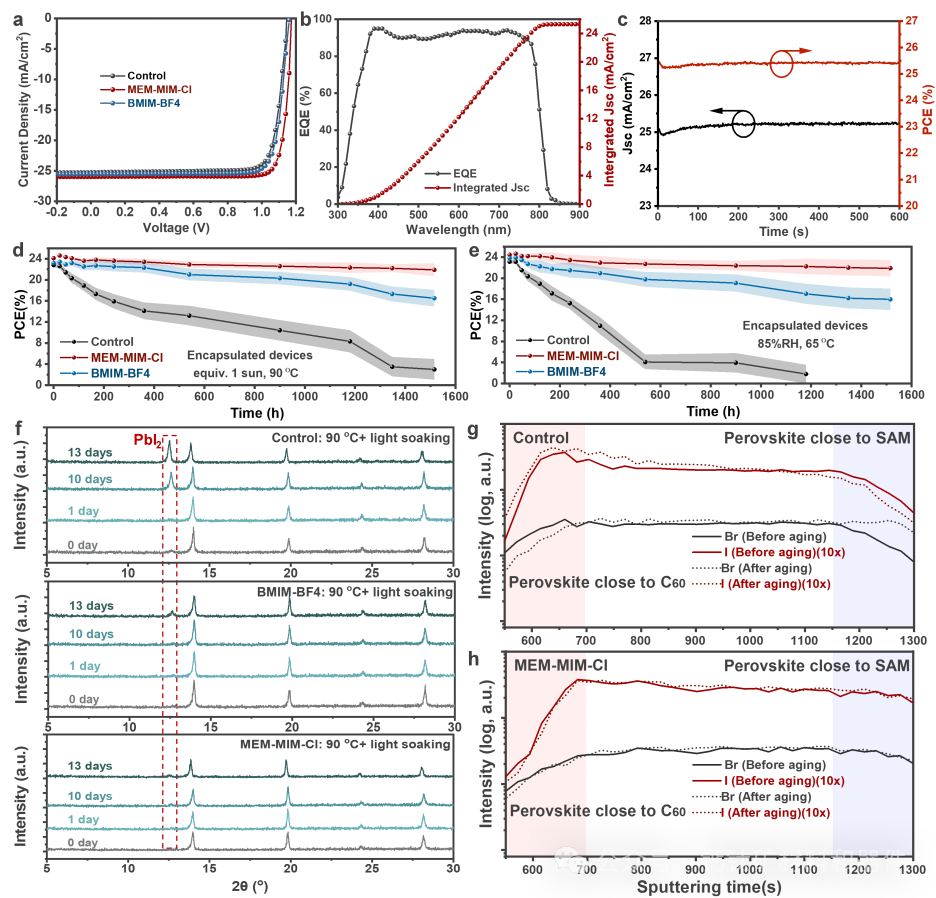 定制化设计的含乙二醇醚侧链的离子液体不仅能够精确调控钙钛矿晶体生长,还能有效稳定埋界面。该离子液体优先富集于钙钛矿底部,可显著抑制碘化铅的聚集及空隙的形成。此类分子设计策略为后续离子液体的开发提供了重要参考平台,而由此带来的钙钛矿稳定性提升也进一步推动了其向商业化应用迈进。(来源:科学网)