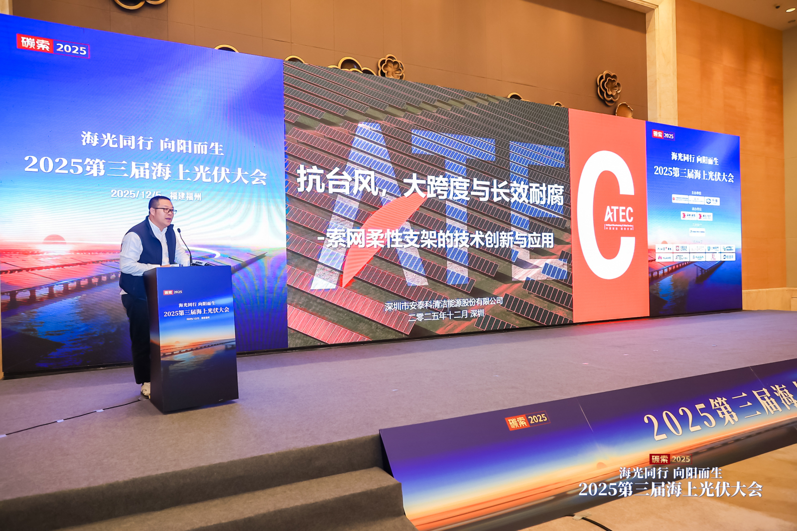 会上,深圳市安泰科清洁能源股份有限公司技术总监魏泽龙重磅发布索网柔性支架技术创新成果,以大跨度、抗台风、长效耐腐的核心优势,为海上光伏产业突破瓶颈提供全新解决方案。