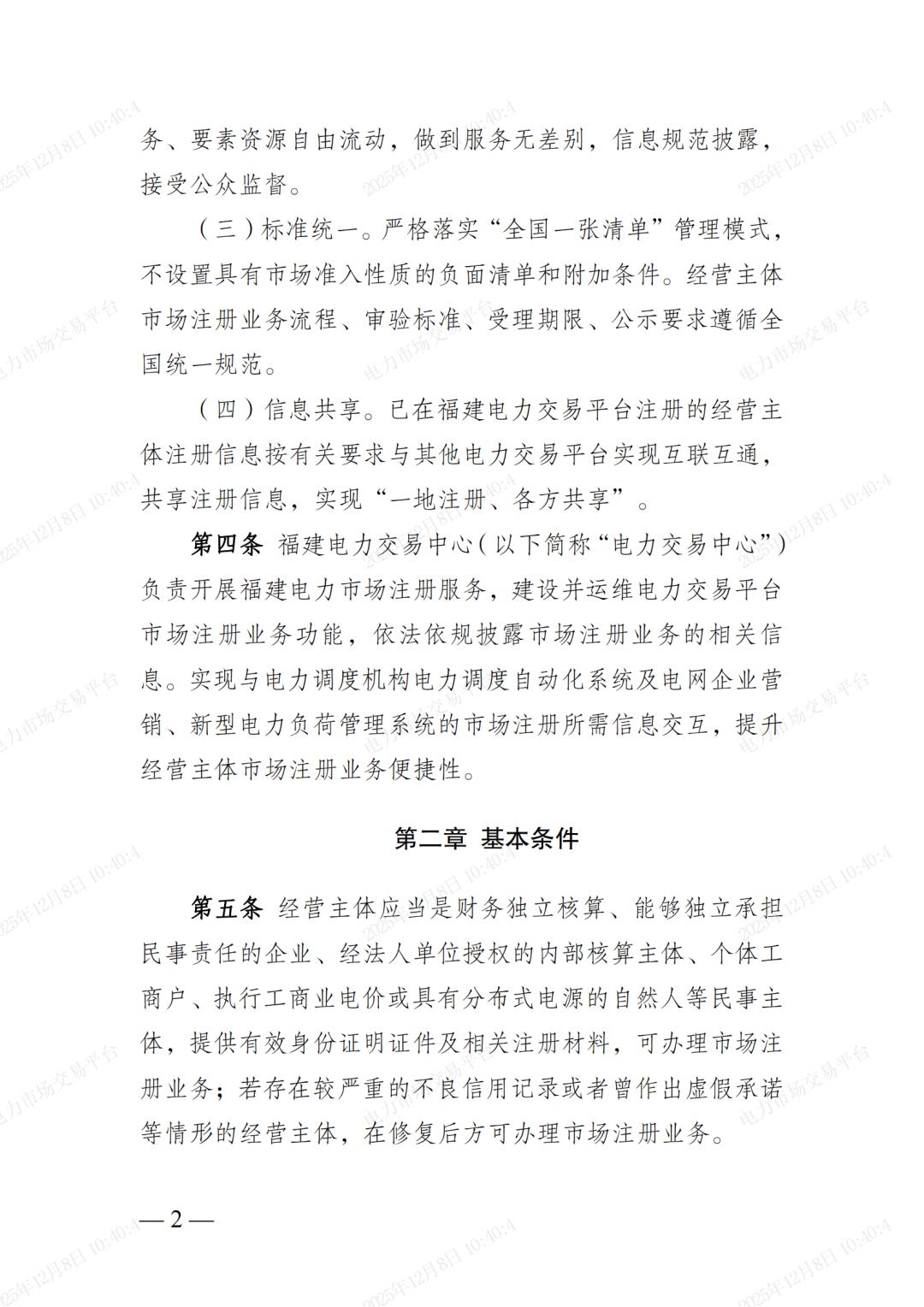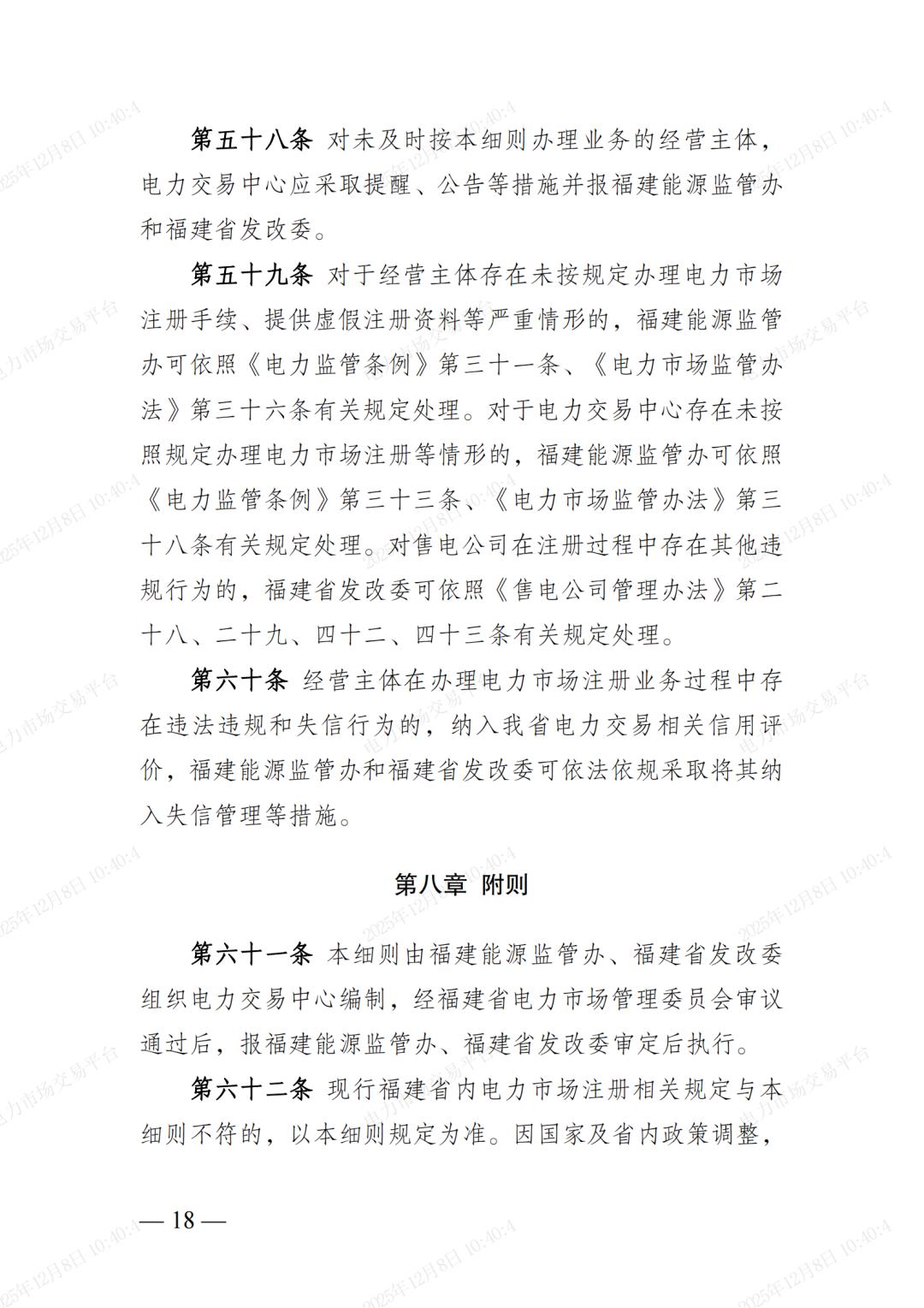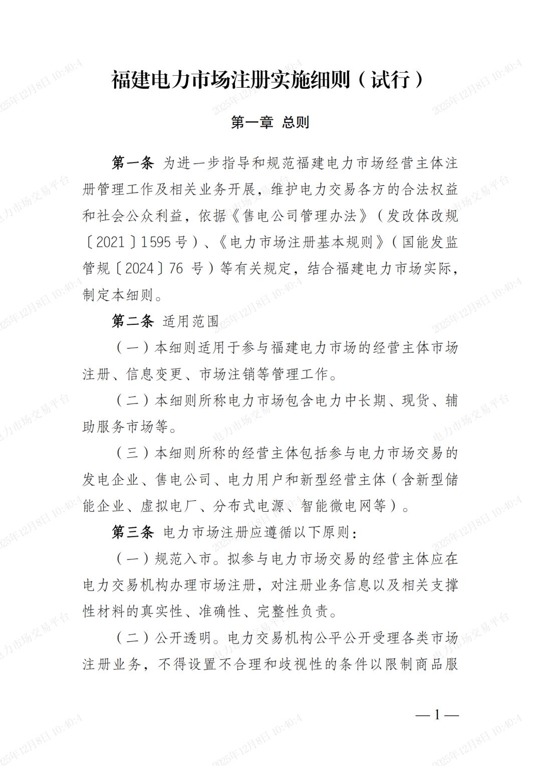 为进一步规范福建电力市场经营主体注册管理管理工作,保障市场注册工作平稳有序开展,切实维护市场秩序和经营主体合法权益,根据《国家能源局关于印发<电力市场注册基本规则>的通知》(国能发监管规〔2024〕76 号),福建电力交易中心会同相关部门编制形成《福建电力市场注册实施细则(试行)》(以下简称《细则》)。《细则》已完成向全社会公开征求意见并经福建省电力市场管理委员会审议通过,报福建能源监管办和福建省发改委最终审定,现予以印发。