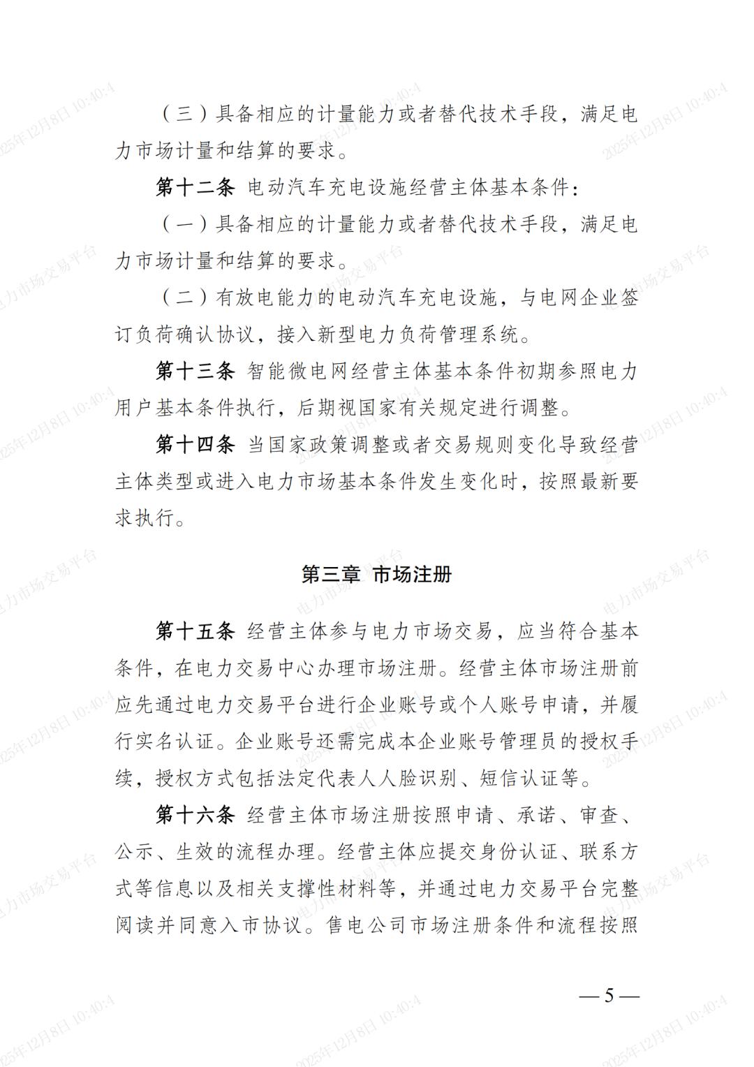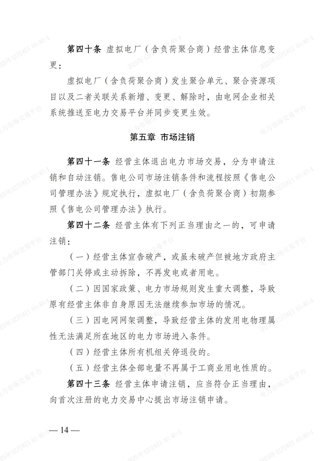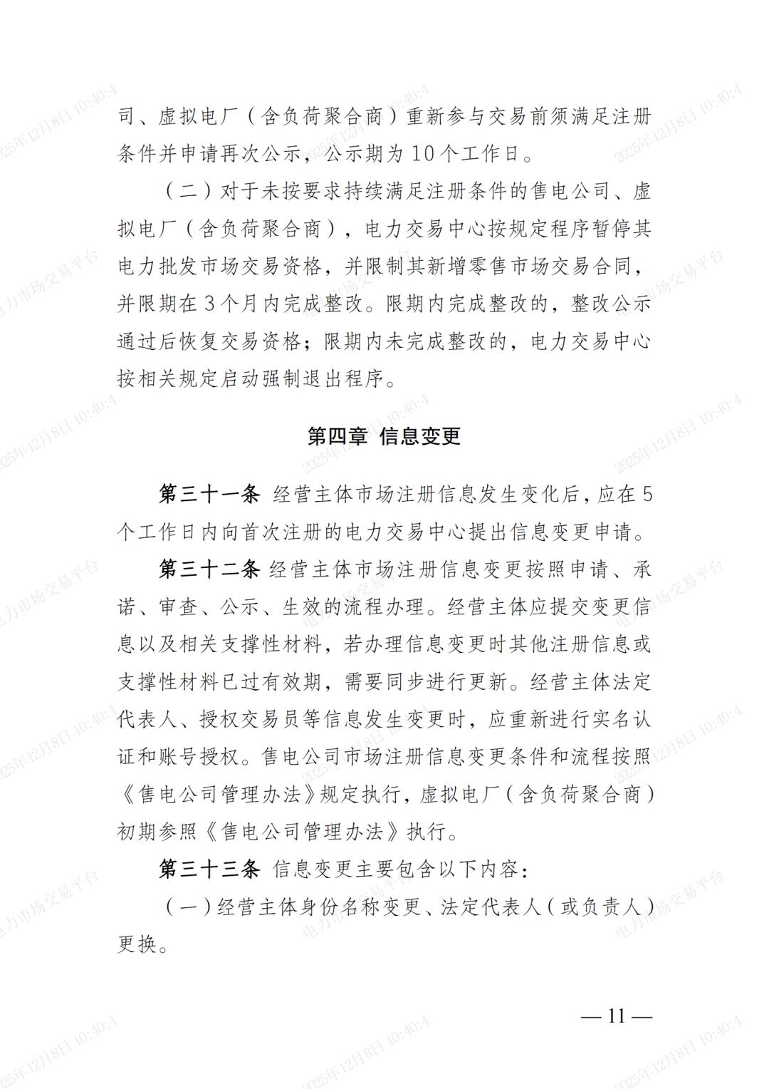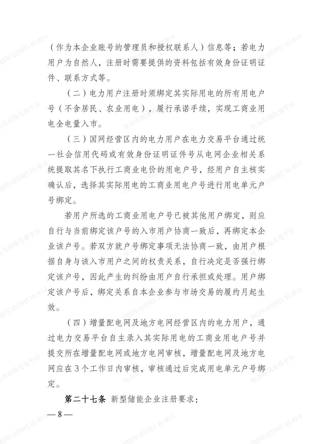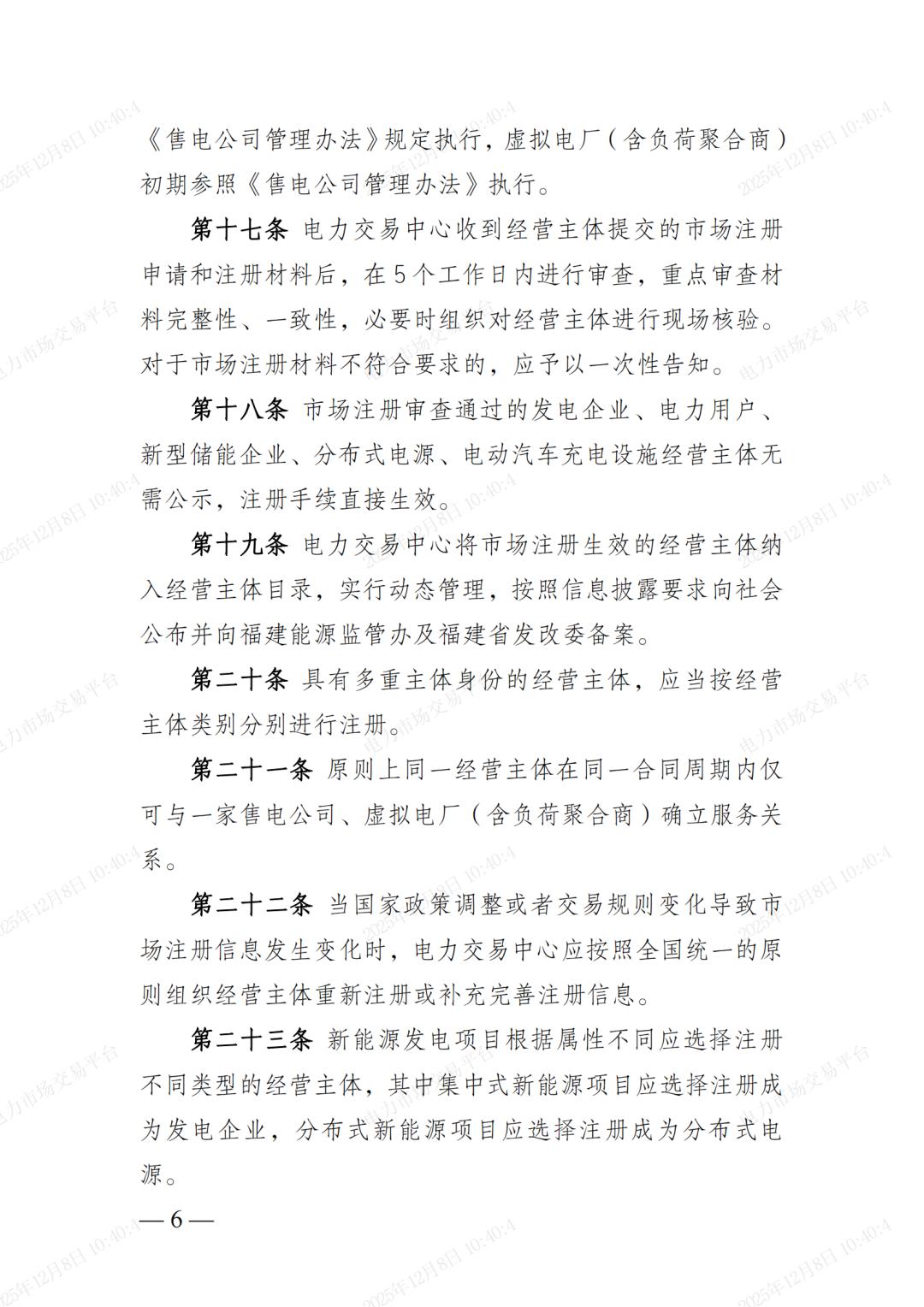 12月5日,福建电力交易中心发布关于印发《福建电力市场注册实施细则(试行)》的通知。原则上同一经营主体在同一合同周期内仅可与一家售电公司、虚拟电厂(含负荷聚合商)确立服务关系。新能源发电项目根据属性不同应选择注册不同类型的经营主体,其中集中式新能源项目应选择注册成为发电企业,分布式新能源项目应选择注册成为分布式电源。经营主体退出电力市场交易,分为申请注销和自动注销。售电公司市场注销条件和流程按照《售电公司管理办法》规定执行,虚拟电厂(含负荷聚合商)初期参照《售电公司管理办法》执行。