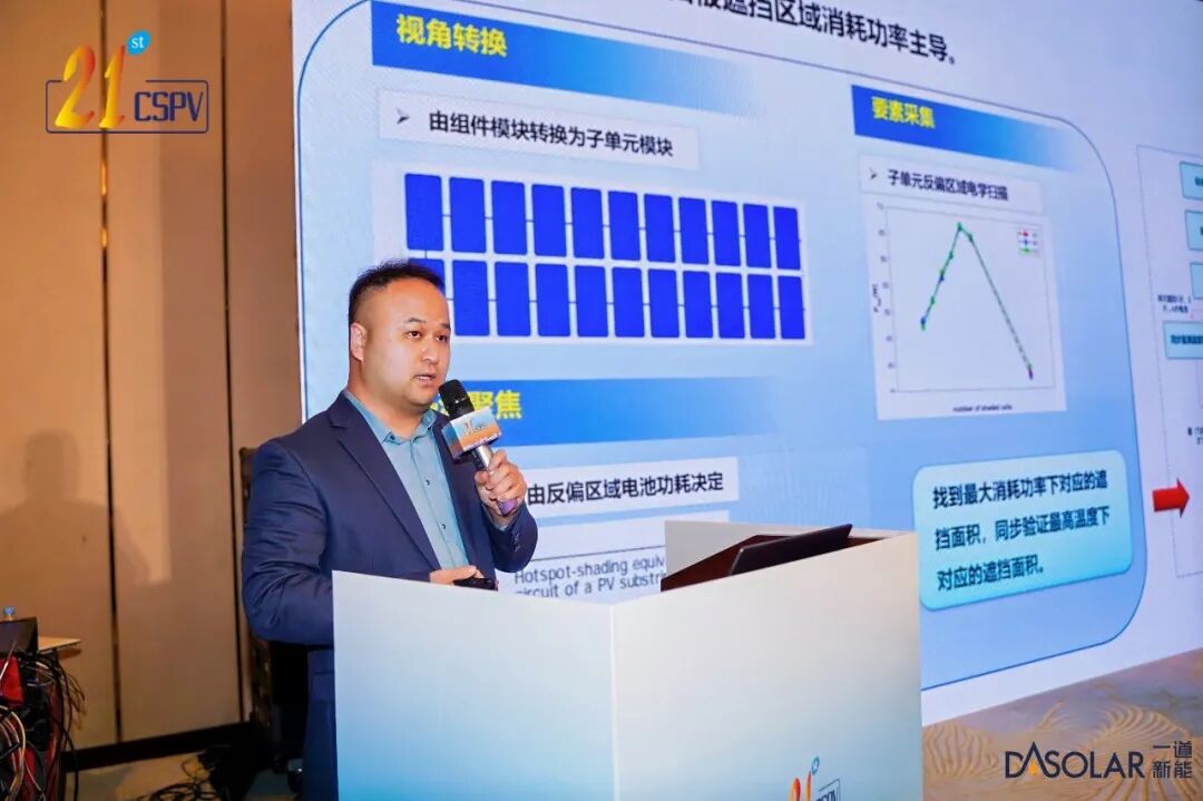 李家栋先生发表了《一道新能 DBC 组件热斑性能研究: DBC 组件热斑精准量化、可靠性筛选新进展》。他表示,一道新能 DBC 组件通过电池片自优化抗热斑设计,实现热斑温度较传统组件降低 50℃左右,弱光系数提升至 95% 以上,大幅提升复杂光照环境下的稳定性。该设计从电池结构源头优化载流子收集效率,减少局部遮挡引发的能量堆积,从根本上抑制热斑生成与蔓延。同时,建立了等效电路模型,提出了一种子串-组件两级协同方法,该方法能够快速准确地识别与最大功率耗散相对应的阴影区域,与传统方法相比,显著提高了测试效率和精度。