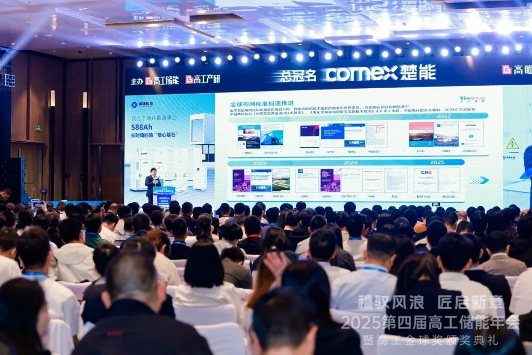 12月9日,由高工储能与高工产业研究院(GGII)主办的2025高工储能年会暨高工金球颁奖典礼在深圳举行。会议聚焦储能技术突破、安全应用与产业生态,旨在推动行业稳进创新。天合储能全球产品管理和解决方案负责人邓伟在会上正式推出面向AIDC场景的绿色综合能源解决方案,并以《天合储能的构网型实践与AIDC场景探索》为主题发表演讲,系统分享了天合储能在构网型储能领域的技术成果与实践经验,为零碳未来提供可持续、高可靠、高效率的能源支撑。
