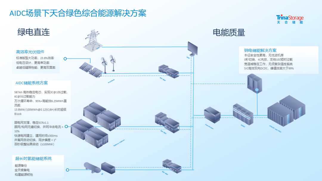 基于这一趋势,邓伟在演讲中提出了光储发电的绿色综合能源解决方案。该方案在度电成本、建设周期、碳排放及政策适配性方面表现突出,经济性显著优于煤电、气电与核电,并具备快速部署能力。同时,方案深度融合高功率密度效率光伏发电系统、构网型储能系统、长时储能、高倍率电池系统及超长时氢能储能系统,构建覆盖发电、储电、用电全链条的智慧能源体系。不仅能够通过高效光伏系统实现绿电直连,降低用电成本与碳足迹,还可依托构网型储能系统提供弱电网支撑、百秒级整站黑启动、弱网稳定运行等关键功能,保障数据中心在复杂电网环境下的连续可靠供电,有效支撑数据中心业务零中断运行,实现清洁能源高效利用与系统稳定运行的双重目标。天合于青海三江源国家生态保护核心区落地的全球最高海拔零碳算力项目是该解决方案的有力实证,作为全球首个零碳数据中心,该项目以“源-网-荷-储-算”五维协同模式,成功解决极端环境下能源供应稳定性与生态兼容性难题,为行业展示了可复制、可推广的示范标杆。