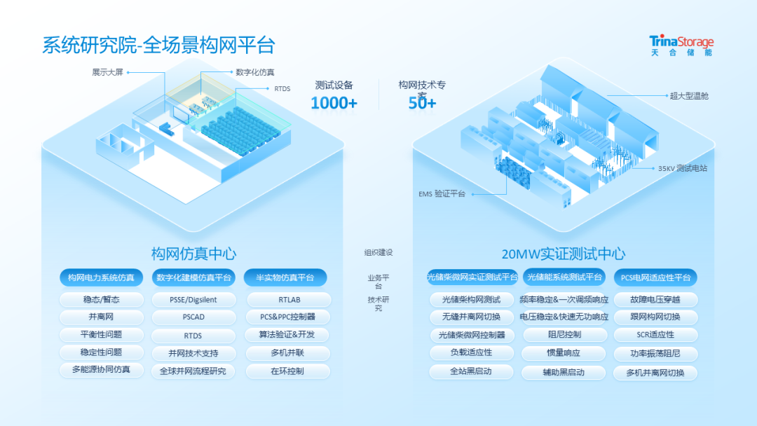 为满足AIDC场景对电能质量、系统韧性及长期备电的严苛要求,天合储能依托全栈自研与垂直整合能力,构建了从电芯、PCS、EMS到系统集成的完整技术链。此外,公司还设立多个涵盖电池研发、电力电子、系统集成、实证测试的研究院和包括构网仿真中心、20MW实证测试中心在内的实验平台,具备极强的研发与验证能力。